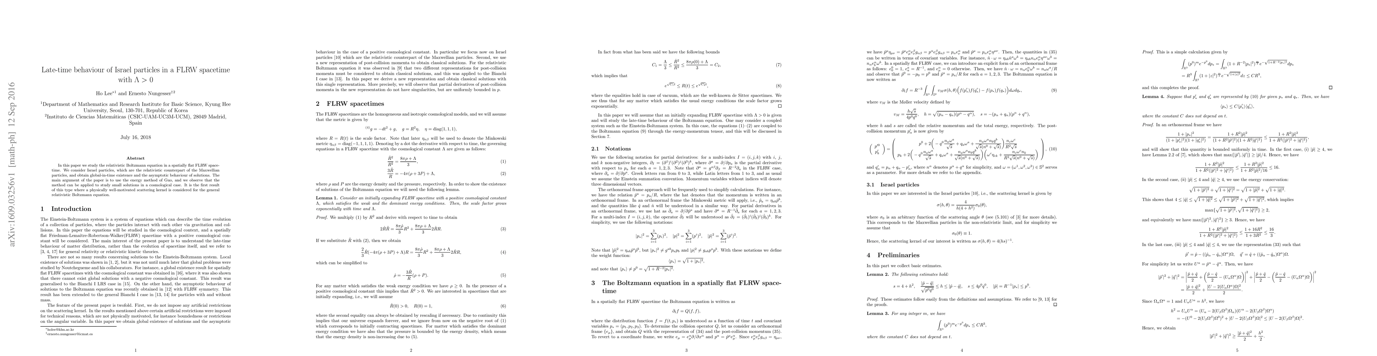 This paper studies the behavior of relativistic particles in a flat spacetime with positive lambda, focusing on Israel particles and their asymptotic behavior. It uses an energy method to establish global-in-time existence and small solution validity.