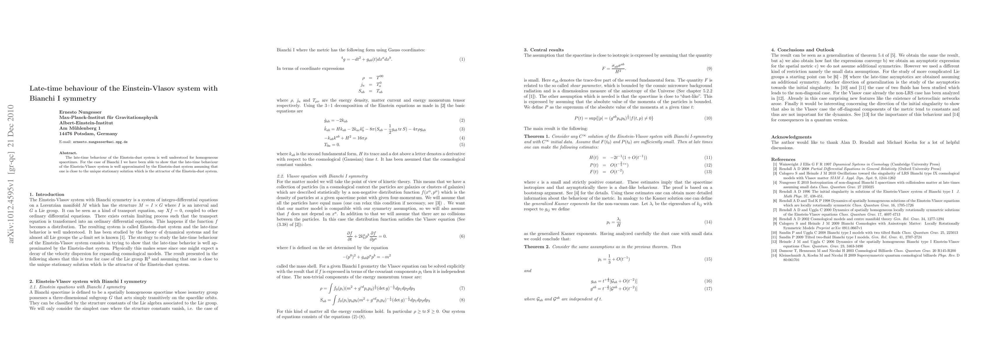 The late-time behaviour of the Einstein-dust system is well understood for homogeneous spacetimes. For the case of Bianchi I we have been able to show that the late-time behaviour of the Einstein-Vlasov system is well approximated by the Einstein-dust system assuming that one is close to the unique stationary solution which is the attractor of the Einstein-dust system.