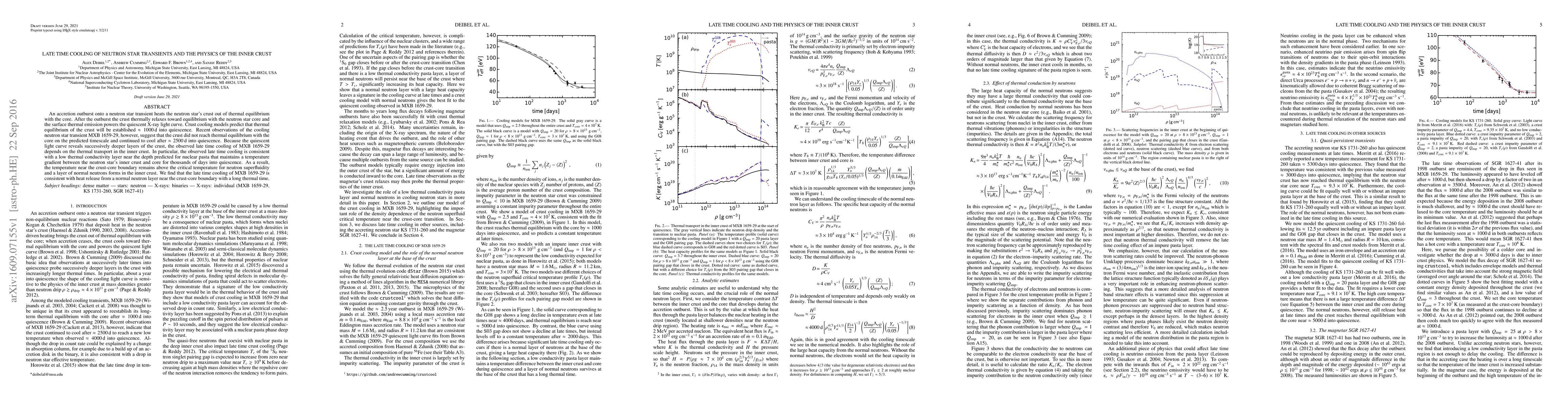 This paper investigates the late time cooling of neutron star transients, focusing on the thermal relaxation of the crust after an accretion outburst. Observations of MXB 1659-29 suggest prolonged cooling beyond the predicted thermal equilibrium timescale, indicating a low thermal conductivity layer in the inner crust, likely nuclear pasta, which maintains a temperature gradient and forms a layer of normal neutrons.