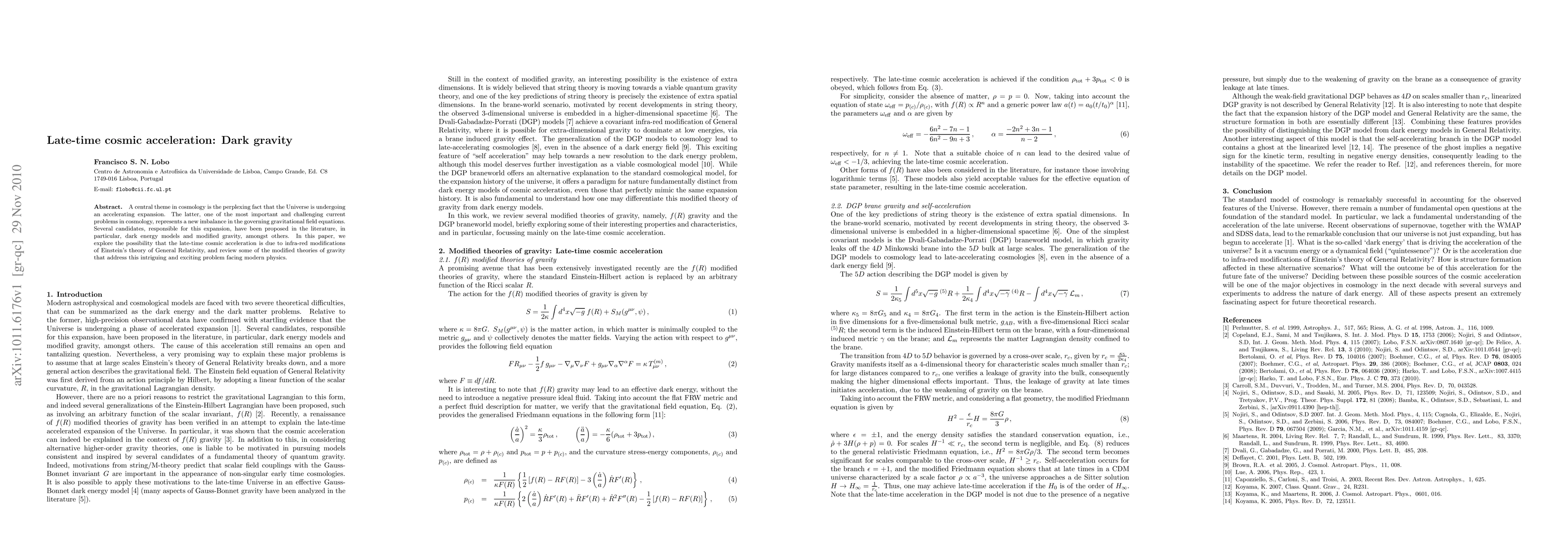 This paper investigates the possibility that late-time cosmic acceleration is driven by infra-red modifications to Einstein's General Relativity, reviewing various modified gravity theories that aim to explain the accelerating expansion of the Universe.