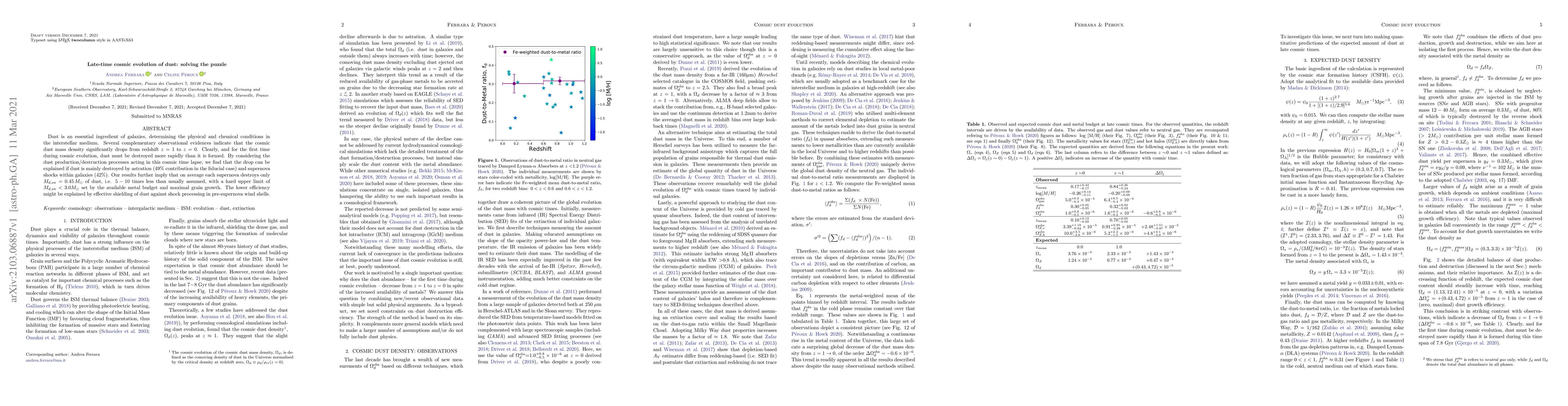 Dust is an essential ingredient of galaxies, determining the physical and chemical conditions in the interstellar medium. Several complementary observational evidences indicate that the cosmic dust mass density significantly drops from redshift $z=1$ to $z=0$. Clearly, and for the first time during cosmic evolution, dust must be destroyed more rapidly than it is formed. By considering the dust production/destruction processes acting in this cosmic time lapse, we find that the drop can be explained if dust is mainly destroyed by astration (49\% contribution in the fiducial case) and supernova shocks within galaxies (42\%). Our results further imply that on average each supernova destroys only $M_{d,sn} =0.45\, M_\odot$ of dust, i.e. $5-10$ times less than usually assumed, with a hard upper limit of $M_{d,sn} < {3.0} M_\odot$ set by the available metal budget and maximal grain growth. The lower efficiency might be explained by effective shielding of dust against shock processing in pre-supernova wind shells.