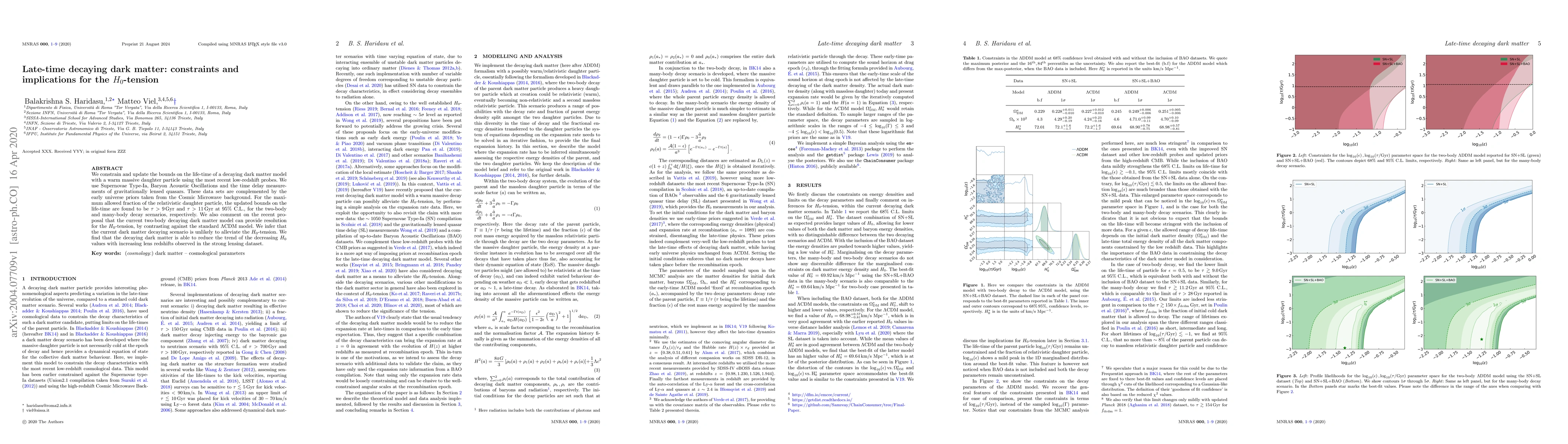 We constrain and update the bounds on the life-time of a decaying dark matter model with a warm massive daughter particle using the most recent low-redshift probes. We use Supernovae Type-Ia, Baryon Acoustic Oscillations and the time delay measurements of gravitationally lensed quasars. These data sets are complemented by the early universe priors taken from the Cosmic Microwave background. For the maximum allowed fraction of the relativistic daughter particle, the updated bounds on the life-time are found to be $\tau > 9\, \rm{Gyr}$ and $\tau >11\,\rm{Gyr}$ at $95\%$ C.L., for the two-body and many-body decay scenarios, respectively. We also comment on the recent proposal that the current two-body decaying dark matter model can provide resolution for the $H_0$-tension, by contrasting against the standard $\Lambda$CDM model. We infer that the current dark matter decaying scenario is unlikely to alleviate the $H_0$-tension. We find that the decaying dark matter is able to reduce the trend of the decreasing $H_0$ values with increasing lens redshifts observed in the strong lensing dataset.