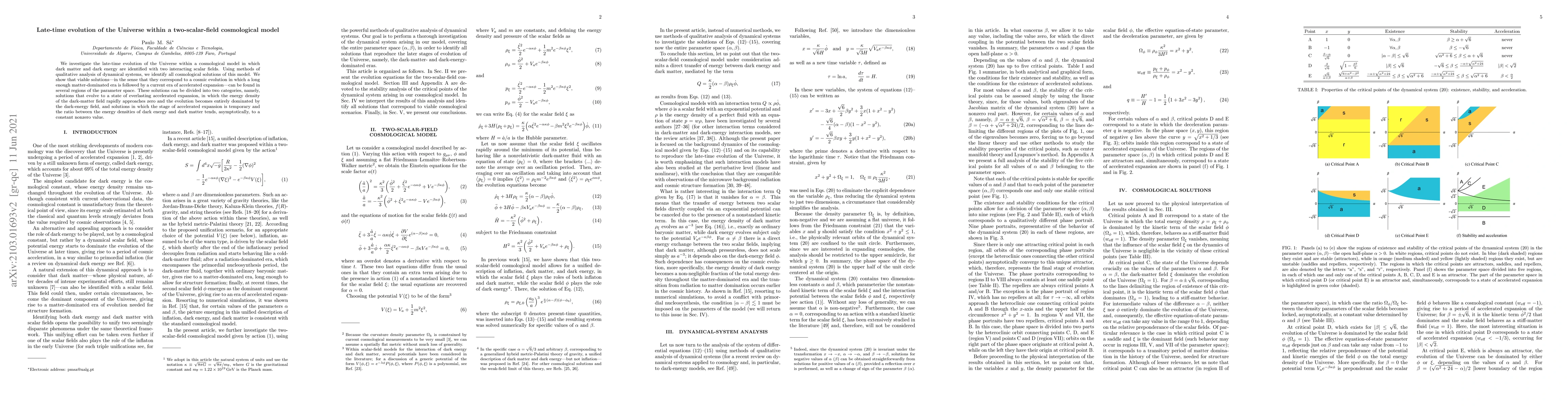 We investigate the late-time evolution of the Universe within a cosmological model in which dark matter and dark energy are identified with two interacting scalar fields. Using methods of qualitative analysis of dynamical systems, we identify all cosmological solutions of this model. We show that viable solutions -- in the sense that they correspond to a cosmic evolution in which a long enough matter-dominated era is followed by a current era of accelerated expansion -- can be found in several regions of the parameter space. These solutions can be divided into two categories, namely, solutions that evolve to a state of everlasting accelerated expansion, in which the energy density of the dark-matter field rapidly approaches zero and the evolution becomes entirely dominated by the dark-energy field, and solutions in which the stage of accelerated expansion is temporary and the ratio between the energy densities of dark energy and dark matter tends, asymptotically, to a constant nonzero value.