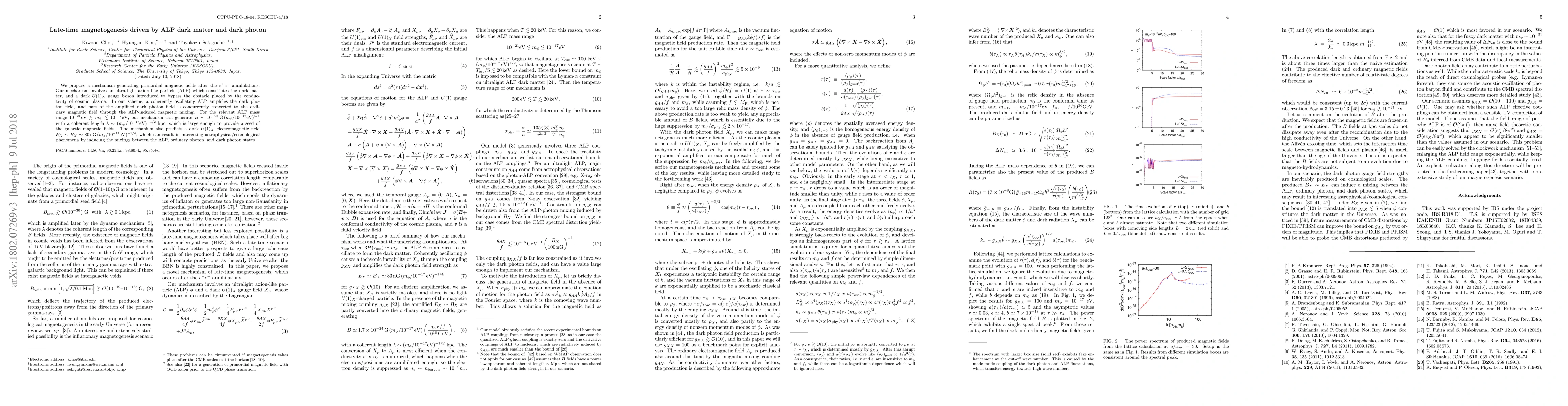 This paper proposes a mechanism for generating primordial magnetic fields via the interaction of ultra-light axion-like particles (ALPs) and dark photons after $e^+e^-$ annihilations. The ALPs, which constitute dark matter, amplify the dark photon field, which then converts into ordinary magnetic fields, potentially seeding galactic magnetic fields.