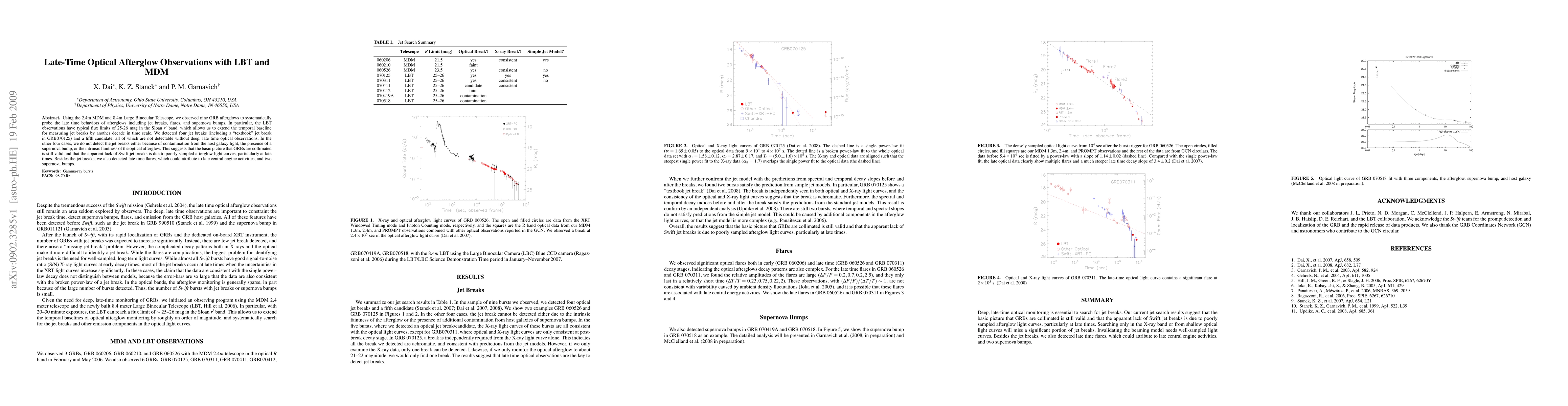 The research utilized the 2.4m MDM and 8.4m Large Binocular Telescope to observe nine GRB afterglows, focusing on late-time behaviors such as jet breaks, flares, and supernova bumps. The LBT observations reached flux limits of 25-26 mag in the Sloan r' band, extending the temporal baseline for measuring jet breaks.