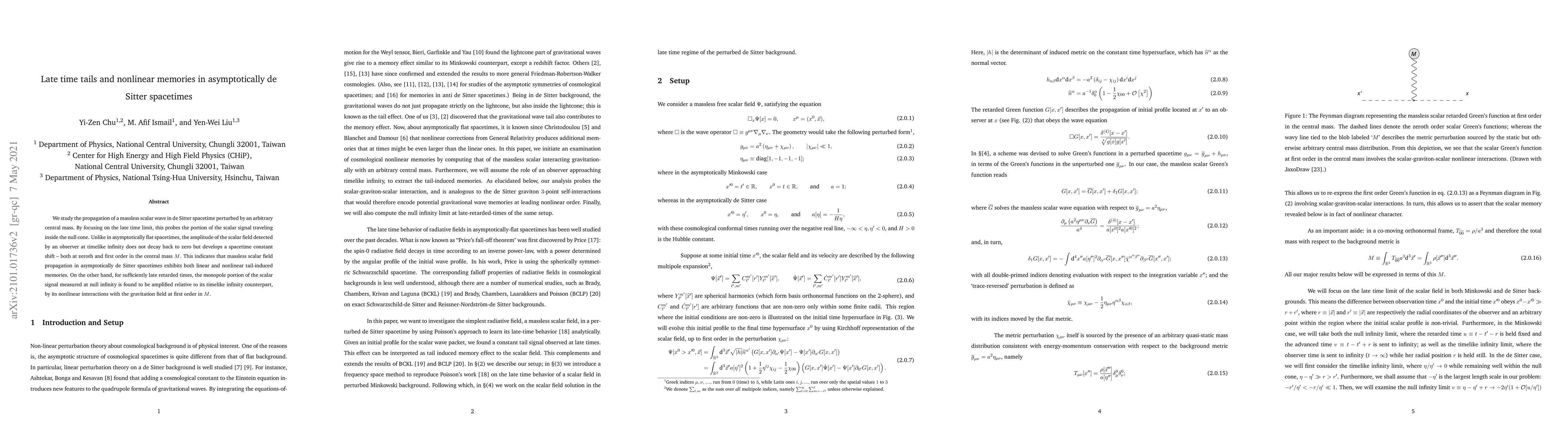 We study the propagation of a massless scalar wave in de Sitter spacetime perturbed by an arbitrary central mass. By focusing on the late time limit, this probes the portion of the scalar signal traveling inside the null cone. Unlike in asymptotically flat spacetimes, the amplitude of the scalar field detected by an observer at timelike infinity does not decay back to zero but develops a spacetime constant shift - both at zeroth and first order in the central mass M. This indicates that massless scalar field propagation in asymptotically de Sitter spacetimes exhibits both linear and nonlinear tail-induced memories. On the other hand, for sufficiently late retarded times, the monopole portion of the scalar signal measured at null infinity is found to be amplified relative to its timelike infinity counterpart, by its nonlinear interactions with the gravitation field at first order in M.