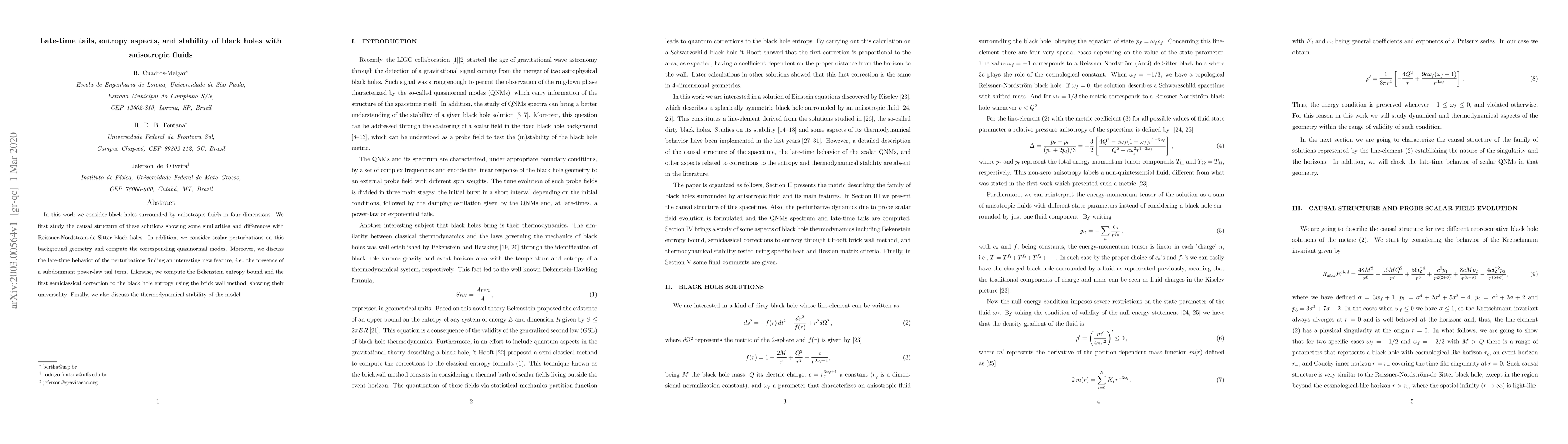In this work we consider black holes surrounded by anisotropic fluids in four dimensions. We first study the causal structure of these solutions showing some similarities and differences with Reissner-Nordstr\"om-de Sitter black holes. In addition, we consider scalar perturbations on this background geometry and compute the corresponding quasinormal modes. Moreover, we discuss the late-time behavior of the perturbations finding an interesting new feature, i.e., the presence of a subdominant power-law tail term. Likewise, we compute the Bekenstein entropy bound and the first semiclassical correction to the black hole entropy using the brick wall method, showing their universality. Finally, we also discuss the thermodynamical stability of the model.