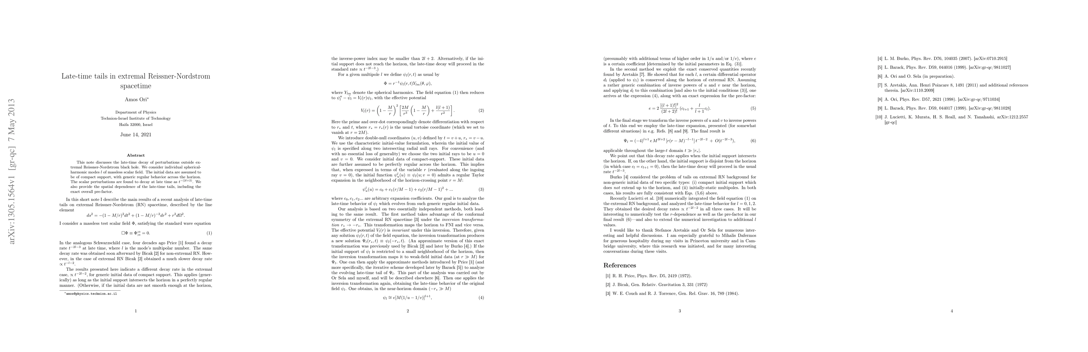This paper investigates the late-time decay of perturbations outside an extremal Reissner-Nordstrom black hole, finding that spherical-harmonic modes of a massless scalar field decay as $t^{-(2l+2)}$, with a specified spatial dependence and pre-factor.