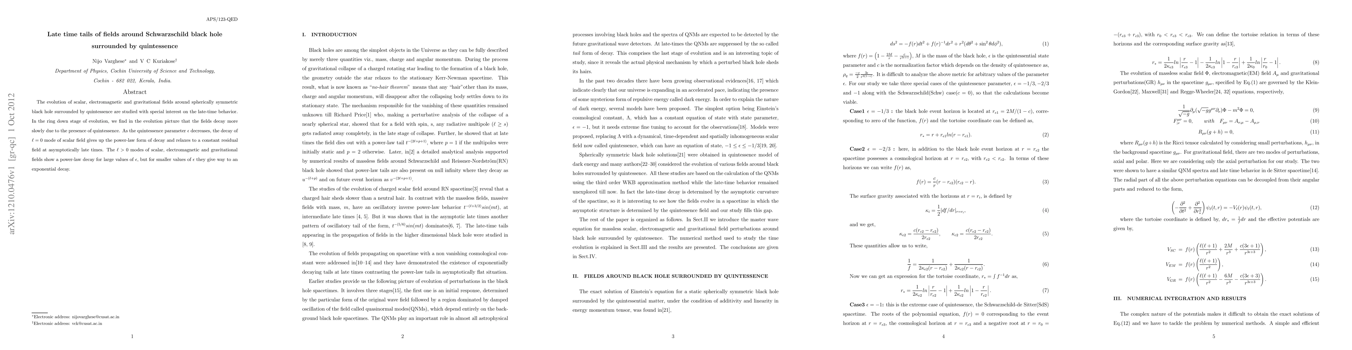 The evolution of scalar, electromagnetic and gravitational fields around spherically symmetric black hole surrounded by quintessence are studied with special interest on the late-time behavior. In the ring down stage of evolution, we find in the evolution picture that the fields decay more slowly due to the presence of quintessence. As the quintessence parameter \epsilon decreases, the decay of l=0 mode of scalar field gives up the power-law form of decay and relaxes to a constant residual field at asymptotically late times. The l>0 modes of scalar, electromagnetic and gravitational fields show a power-law decay for large values of \epsilon, but for smaller values of \epsilon they give way to an exponential decay.