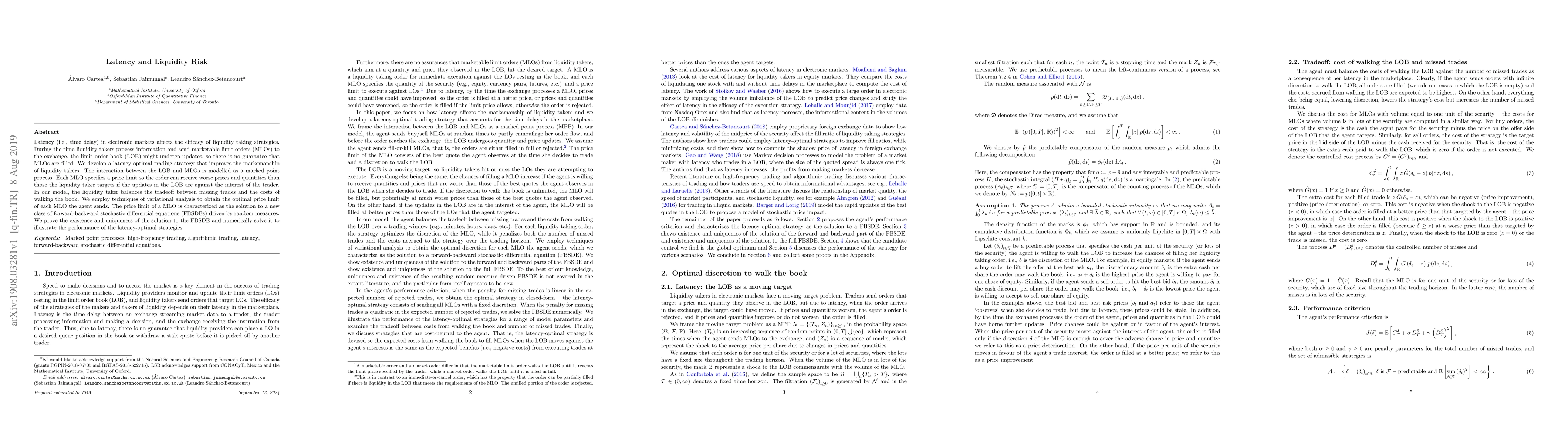 Latency (i.e., time delay) in electronic markets affects the efficacy of liquidity taking strategies. During the time liquidity takers process information and send marketable limit orders (MLOs) to the exchange, the limit order book (LOB) might undergo updates, so there is no guarantee that MLOs are filled. We develop a latency-optimal trading strategy that improves the marksmanship of liquidity takers. The interaction between the LOB and MLOs is modelled as a marked point process. Each MLO specifies a price limit so the order can receive worse prices and quantities than those the liquidity taker targets if the updates in the LOB are against the interest of the trader. In our model, the liquidity taker balances the tradeoff between missing trades and the costs of walking the book. We employ techniques of variational analysis to obtain the optimal price limit of each MLO the agent sends. The price limit of a MLO is characterized as the solution to a new class of forward-backward stochastic differential equations (FBSDEs) driven by random measures. We prove the existence and uniqueness of the solution to the FBSDE and numerically solve it to illustrate the performance of the latency-optimal strategies.