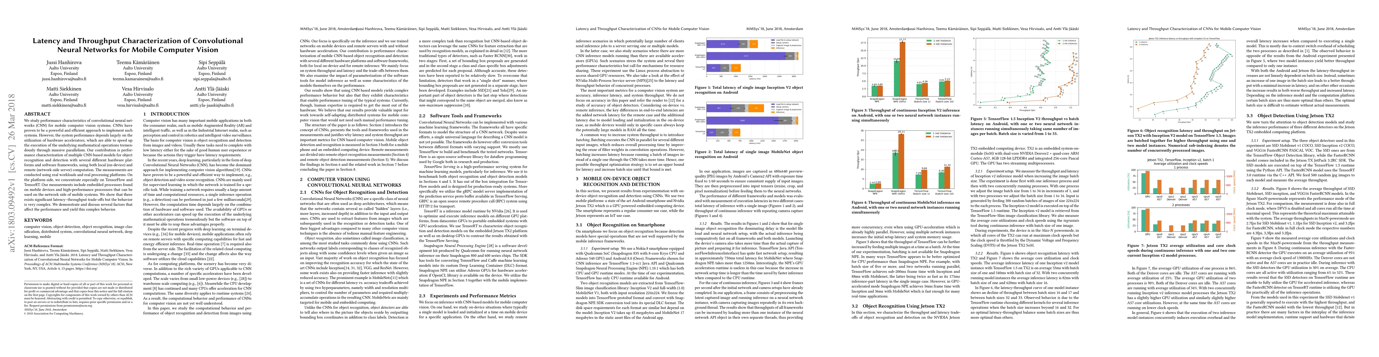 We study performance characteristics of convolutional neural networks (CNN) for mobile computer vision systems. CNNs have proven to be a powerful and efficient approach to implement such systems. However, the system performance depends largely on the utilization of hardware accelerators, which are able to speed up the execution of the underlying mathematical operations tremendously through massive parallelism. Our contribution is performance characterization of multiple CNN-based models for object recognition and detection with several different hardware platforms and software frameworks, using both local (on-device) and remote (network-side server) computation. The measurements are conducted using real workloads and real processing platforms. On the platform side, we concentrate especially on TensorFlow and TensorRT. Our measurements include embedded processors found on mobile devices and high-performance processors that can be used on the network side of mobile systems. We show that there exists significant latency--throughput trade-offs but the behavior is very complex. We demonstrate and discuss several factors that affect the performance and yield this complex behavior.