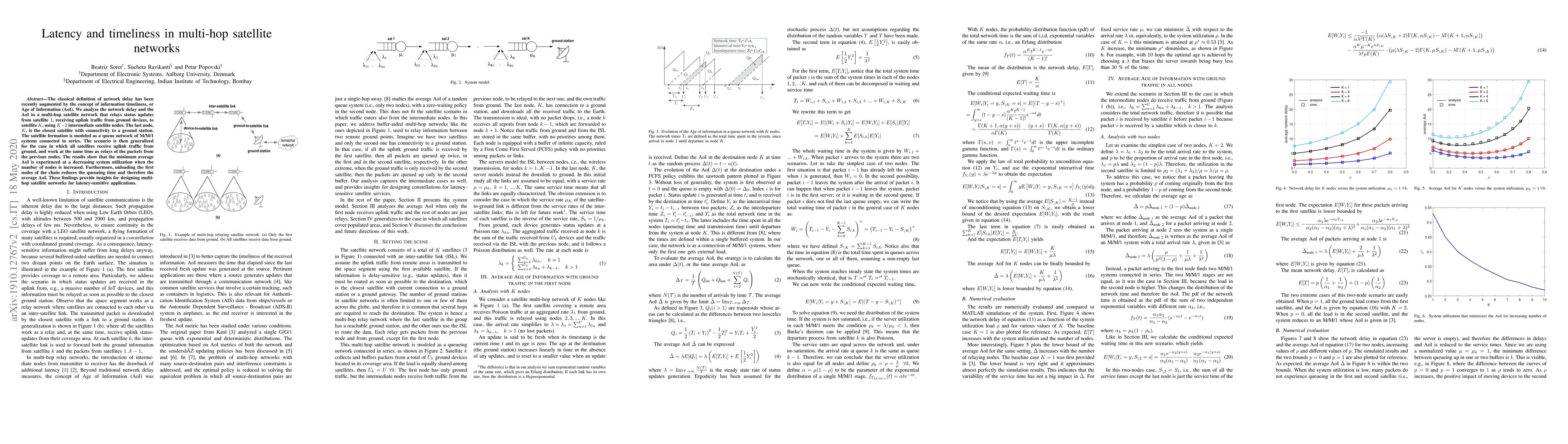 This paper analyzes network delay and Age of Information (AoI) in multi-hop satellite networks, finding that increasing the number of nodes decreases average AoI but at lower system utilization. Unloading initial nodes reduces queueing time and further lowers AoI, offering insights for designing efficient satellite networks for latency-sensitive applications.