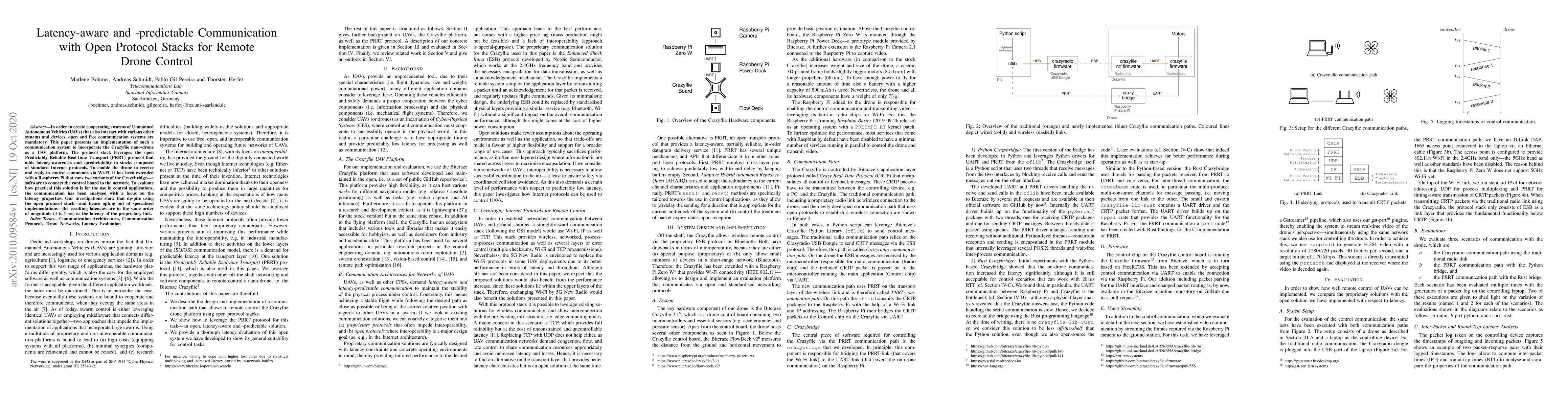 This paper introduces an open communication system for controlling nano-drones using the Crazyflie platform, incorporating the PRRT protocol for latency-awareness and predictability. The system, evaluated for control applications, demonstrates latencies (4-9 ms) comparable to proprietary links, showcasing the practicality of open protocol stacks for drone control.