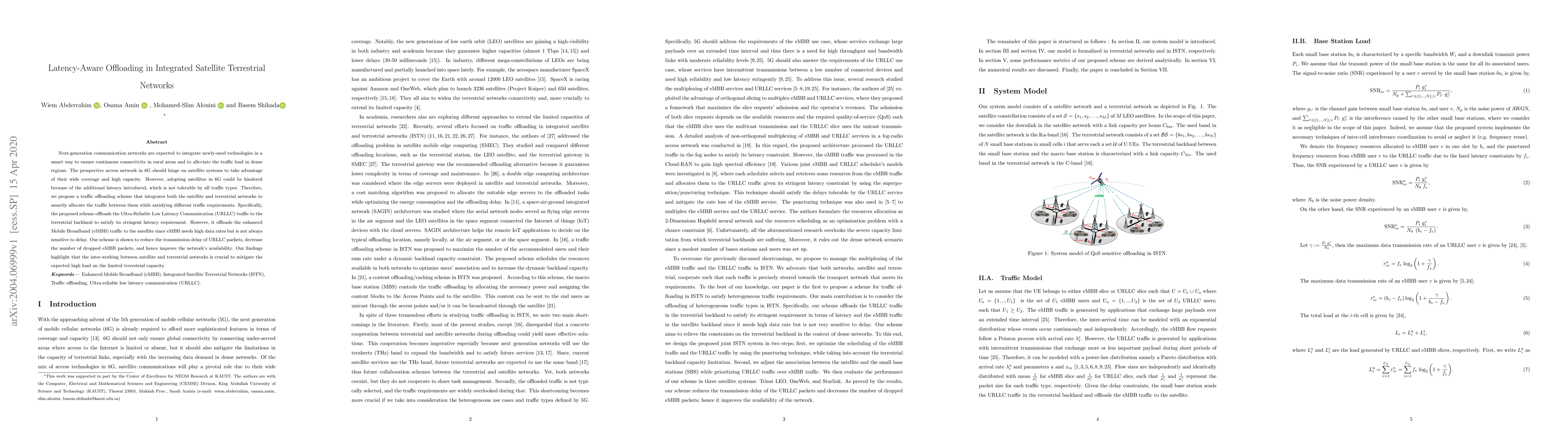 This paper proposes a latency-aware offloading scheme for integrated satellite-terrestrial networks in 6G to balance traffic load and meet diverse latency requirements. The scheme offloads Ultra-Reliable Low Latency Communication (URLLC) to terrestrial networks and enhanced Mobile Broadband (eMBB) to satellites, reducing URLLC latency and improving network availability.