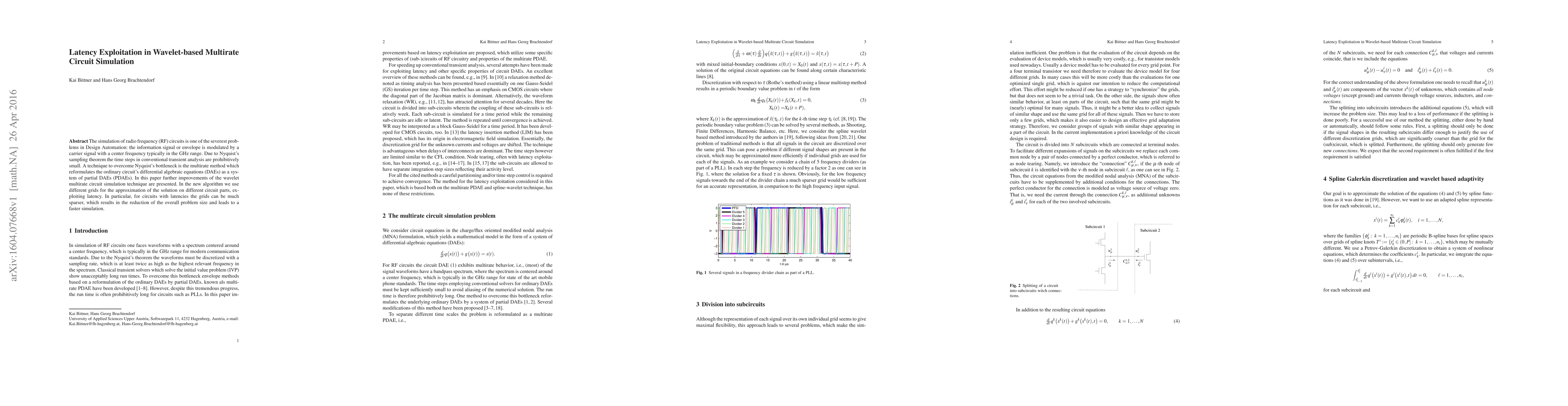 The simulation of radio frequency (RF) circuits is one of the severest problems in Design Automation: the information signal or envelope is modulated by a carrier signal with a center frequency typically in the GHz range. Due to Nyquist's sampling theorem the time steps in conventional transient analysis are prohibitively small. A technique to overcome Nyquist's bottleneck is the multirate method which reformulates the ordinary circuit's differential algebraic equations (DAEs) as a system of partial DAEs (PDAEs). In this paper further improvements of the wavelet multirate circuit simulation technique are presented. In the new algorithm we use different grids for the approximation of the solution on different circuit parts, exploiting latency. In particular, for circuits comprising latent parts the grids can be much sparser, which results in the reduction of the overall problem size and leads to a faster simulation.}