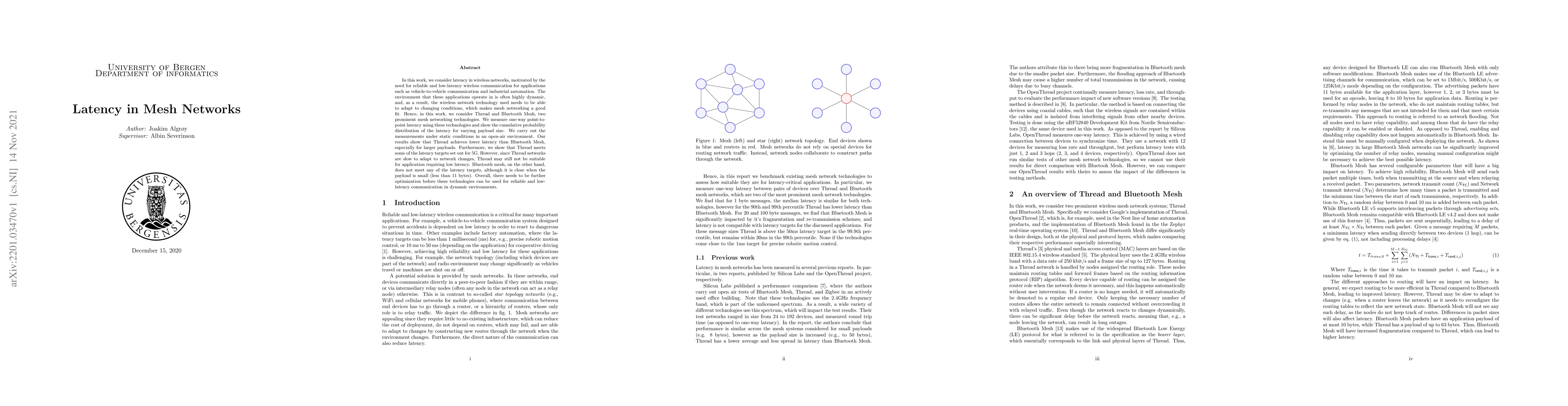 In this work, we consider latency in wireless networks, motivated by the need for reliable and low-latency wireless communication for applications such as vehicle-to-vehicle communication and industrial automation. The environment that these applications operate in is often highly dynamic, and, as a result, the wireless network technology used needs to be able to adapt to changing conditions, which makes mesh networking a good fit. Hence, in this work, we consider Thread and Bluetooth Mesh, two prominent mesh networking technologies. We measure one-way point-to-point latency using these technologies and show the cumulative probability distribution of the latency for varying payload size. We carry out the measurements under static conditions in an open-air environment. Our results show that Thread achieves lower latency than Bluetooth Mesh, especially for larger payloads. Furthermore, we show that Thread meets some of the latency targets set out for 5G. However, since Thread networks are slow to adapt to network changes, Thread may still not be suitable for application requiring low latency. Bluetooth mesh, on the other hand, does not meet any of the latency targets, although it is close when the payload is small (less than 11 bytes). Overall, there needs to be further optimization before these technologies can be used for reliable and low-latency communication in dynamic environments.