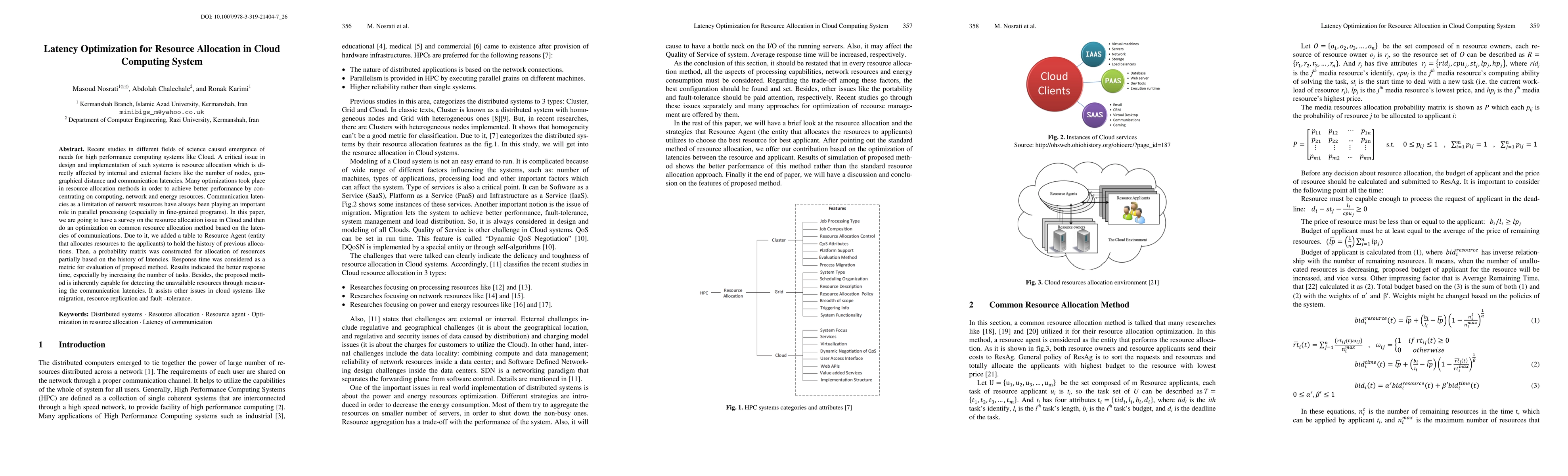 This paper surveys resource allocation methods in cloud computing, focusing on optimizing allocation based on communication latencies. The proposed method uses a history table and a probability matrix to improve response times, especially with more tasks, and aids in detecting unavailable resources, enhancing migration, replication, and fault tolerance.