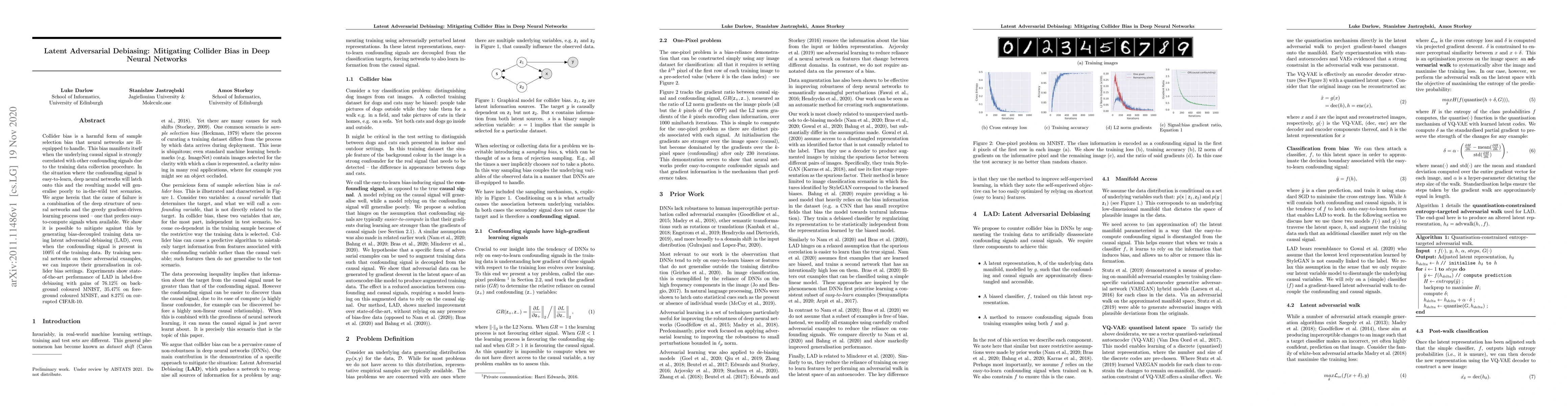 Collider bias is a harmful form of sample selection bias that neural networks are ill-equipped to handle. This bias manifests itself when the underlying causal signal is strongly correlated with other confounding signals due to the training data collection procedure. In the situation where the confounding signal is easy-to-learn, deep neural networks will latch onto this and the resulting model will generalise poorly to in-the-wild test scenarios. We argue herein that the cause of failure is a combination of the deep structure of neural networks and the greedy gradient-driven learning process used - one that prefers easy-to-compute signals when available. We show it is possible to mitigate against this by generating bias-decoupled training data using latent adversarial debiasing (LAD), even when the confounding signal is present in 100% of the training data. By training neural networks on these adversarial examples,we can improve their generalisation in collider bias settings. Experiments show state-of-the-art performance of LAD in label-free debiasing with gains of 76.12% on background coloured MNIST, 35.47% on fore-ground coloured MNIST, and 8.27% on corrupted CIFAR-10.