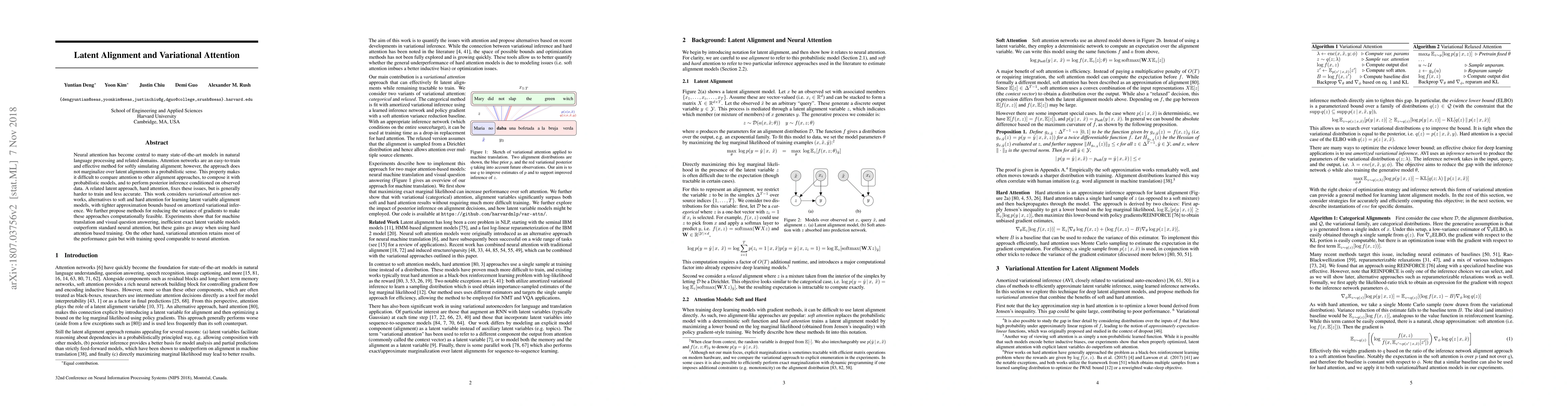 This paper proposes variational attention networks as an alternative to traditional neural attention, aiming to address the lack of probabilistic alignment in neural attention models. The study finds that variational attention retains performance gains while offering better training efficiency compared to hard attention.
