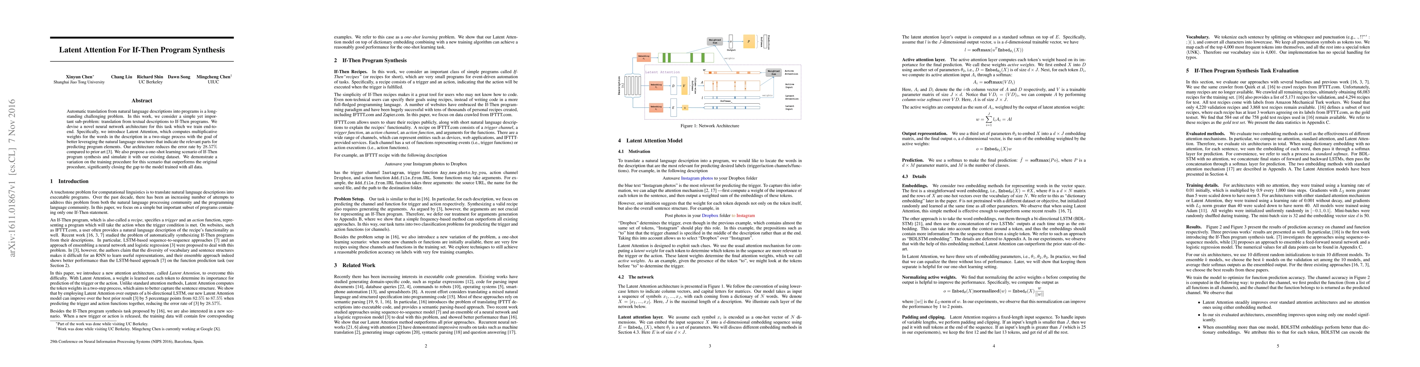 This paper introduces a novel neural network architecture with Latent Attention for translating textual descriptions into If-Then programs, reducing error rates by 28.57% compared to previous methods. It also explores a one-shot learning scenario, demonstrating improved performance with a modified training procedure.