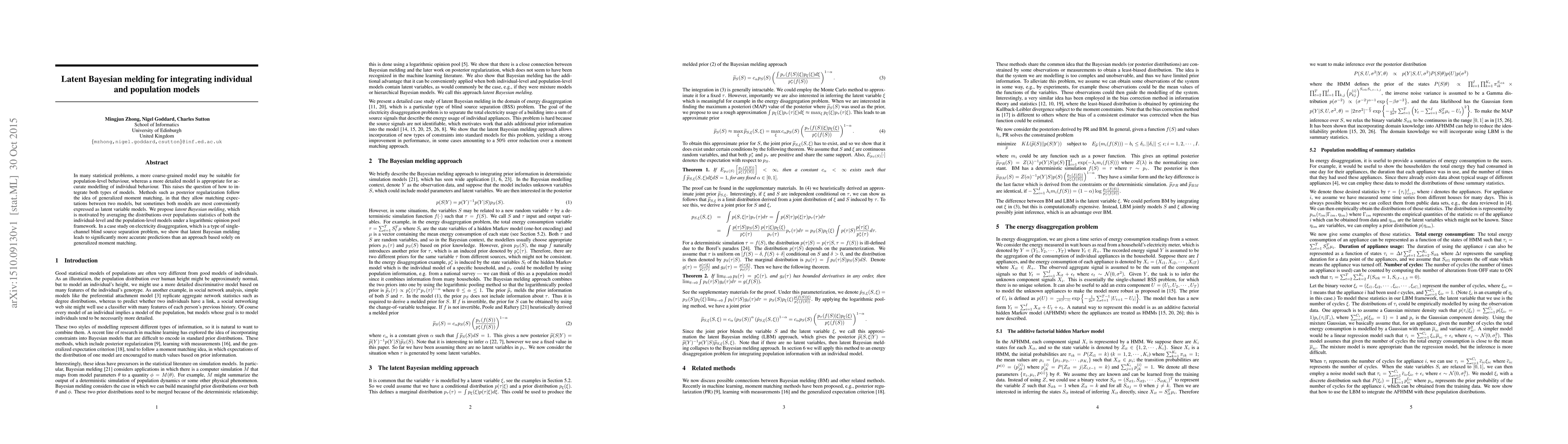 This paper proposes latent Bayesian melding to integrate individual and population models by averaging their distributions under a logarithmic opinion pool framework. In an electricity disaggregation case study, it demonstrates that this method yields more accurate predictions than generalized moment matching.