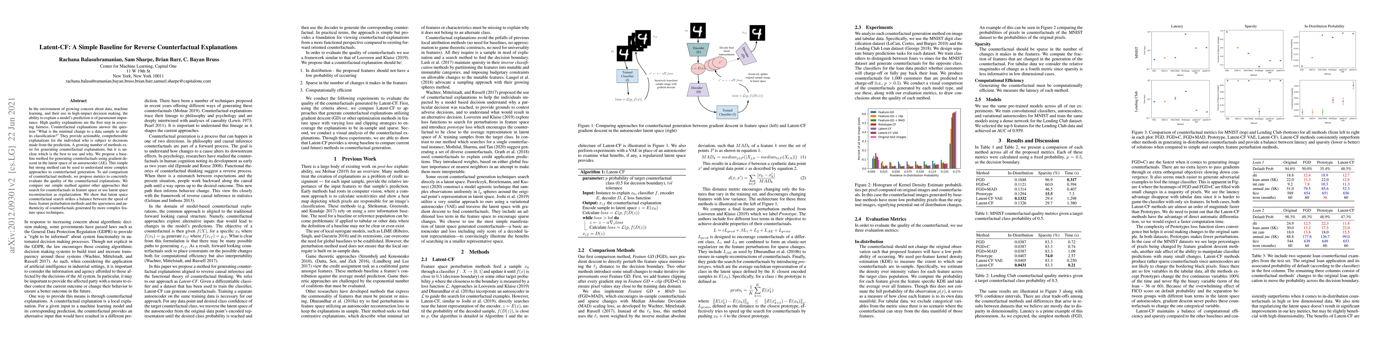 In the environment of fair lending laws and the General Data Protection Regulation (GDPR), the ability to explain a model's prediction is of paramount importance. High quality explanations are the first step in assessing fairness. Counterfactuals are valuable tools for explainability. They provide actionable, comprehensible explanations for the individual who is subject to decisions made from the prediction. It is important to find a baseline for producing them. We propose a simple method for generating counterfactuals by using gradient descent to search in the latent space of an autoencoder and benchmark our method against approaches that search for counterfactuals in feature space. Additionally, we implement metrics to concretely evaluate the quality of the counterfactuals. We show that latent space counterfactual generation strikes a balance between the speed of basic feature gradient descent methods and the sparseness and authenticity of counterfactuals generated by more complex feature space oriented techniques.