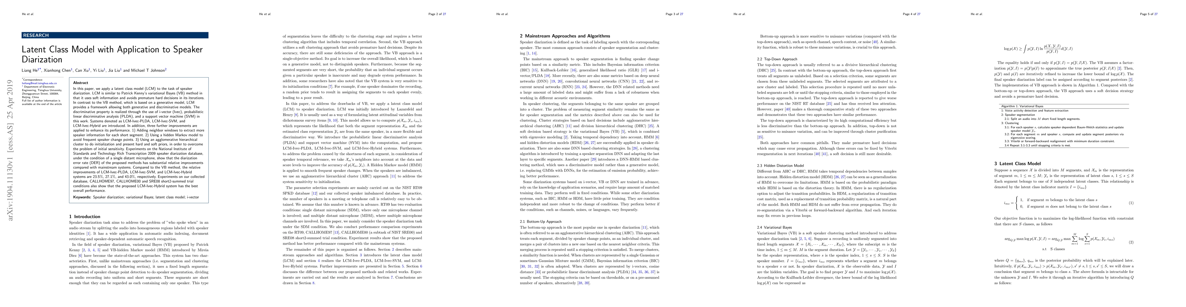 This paper applies a Latent Class Model (LCM) to speaker diarization, combining generative and discriminative modeling using i-vector, PLDA, and SVM. It introduces LCM-Ivec-PLDA, LCM-Ivec-SVM, and LCM-Ivec-Hybrid systems, enhancing performance with neighbor windows, a HMM to reduce speaker change points, and agglomerative hierarchical clustering for initialization. Results show substantial DER reductions compared to mainstream systems and the VB method on NIST Rich Transcription 2009 and other databases.