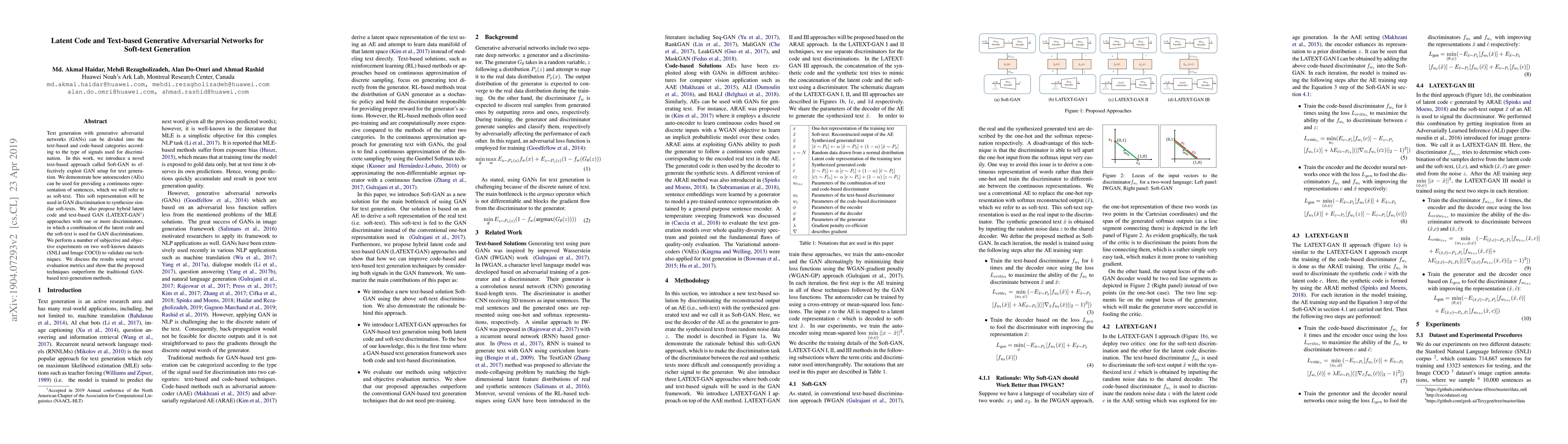 This paper introduces Soft-GAN, a text-based GAN approach for generating soft-text representations using autoencoders, and LATEXT-GAN, a hybrid method combining latent codes and soft-text for GAN discrimination. Experiments on SNLI and Image COCO datasets show superior performance over traditional GAN-based text generation methods.