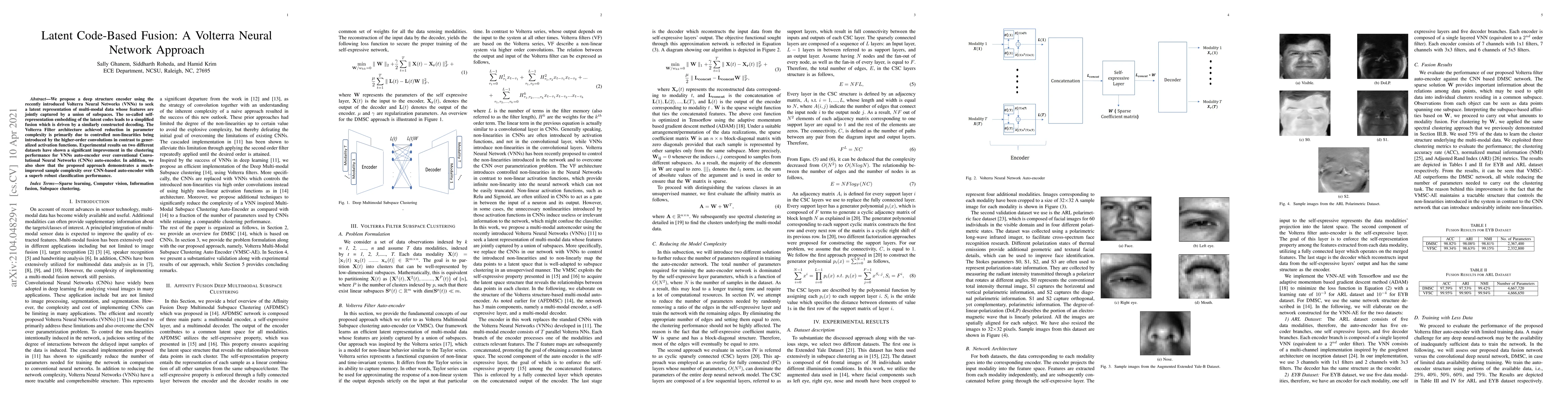 We propose a deep structure encoder using the recently introduced Volterra Neural Networks (VNNs) to seek a latent representation of multi-modal data whose features are jointly captured by a union of subspaces. The so-called self-representation embedding of the latent codes leads to a simplified fusion which is driven by a similarly constructed decoding. The Volterra Filter architecture achieved reduction in parameter complexity is primarily due to controlled non-linearities being introduced by the higher-order convolutions in contrast to generalized activation functions. Experimental results on two different datasets have shown a significant improvement in the clustering performance for VNNs auto-encoder over conventional Convolutional Neural Networks (CNNs) auto-encoder. In addition, we also show that the proposed approach demonstrates a much-improved sample complexity over CNN-based auto-encoder with a superb robust classification performance.