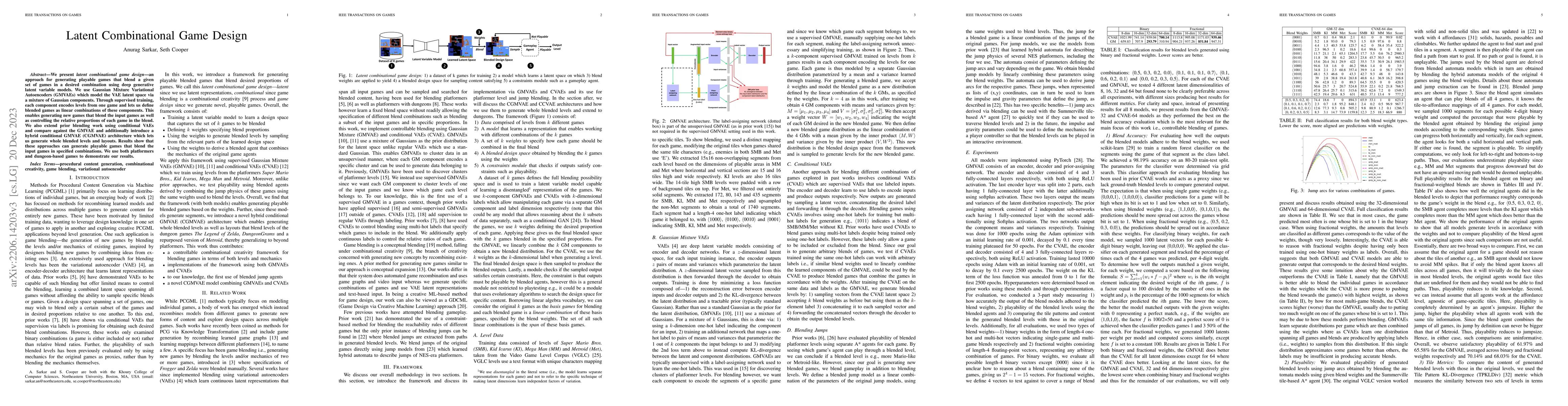 This paper introduces latent combinational game design using deep generative models to blend given games into new, controllable blends. It employs Gaussian Mixture Variational Autoencoders (GMVAEs) to encode and combine game levels, enabling the generation of blended games with specified proportions.