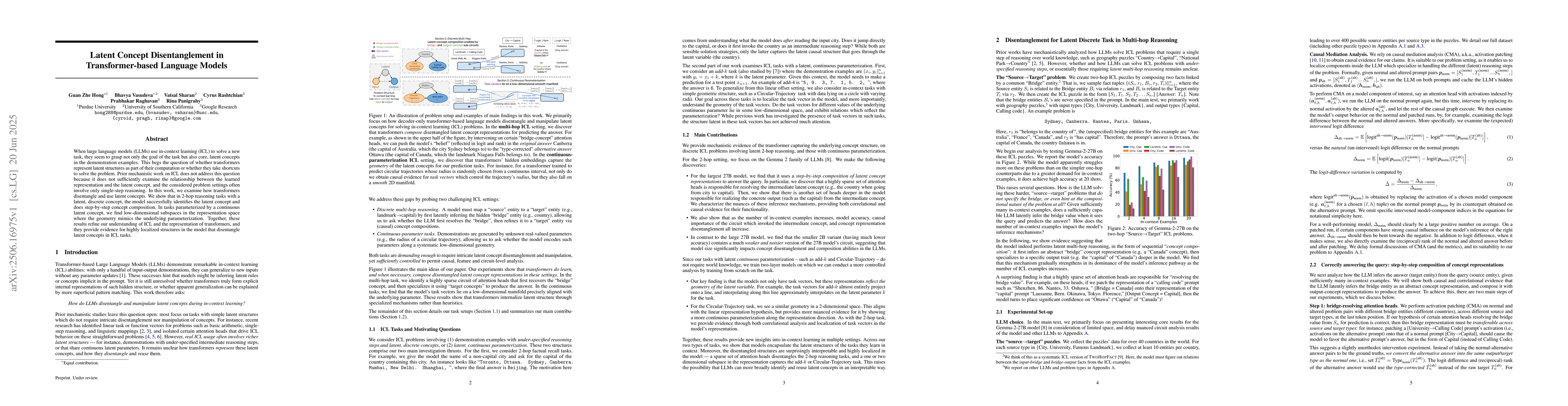 When large language models (LLMs) use in-context learning (ICL) to solve a new task, they seem to grasp not only the goal of the task but also core, latent concepts in the demonstration examples. This begs the question of whether transformers represent latent structures as part of their computation or whether they take shortcuts to solve the problem. Prior mechanistic work on ICL does not address this question because it does not sufficiently examine the relationship between the learned representation and the latent concept, and the considered problem settings often involve only single-step reasoning. In this work, we examine how transformers disentangle and use latent concepts. We show that in 2-hop reasoning tasks with a latent, discrete concept, the model successfully identifies the latent concept and does step-by-step concept composition. In tasks parameterized by a continuous latent concept, we find low-dimensional subspaces in the representation space where the geometry mimics the underlying parameterization. Together, these results refine our understanding of ICL and the representation of transformers, and they provide evidence for highly localized structures in the model that disentangle latent concepts in ICL tasks.