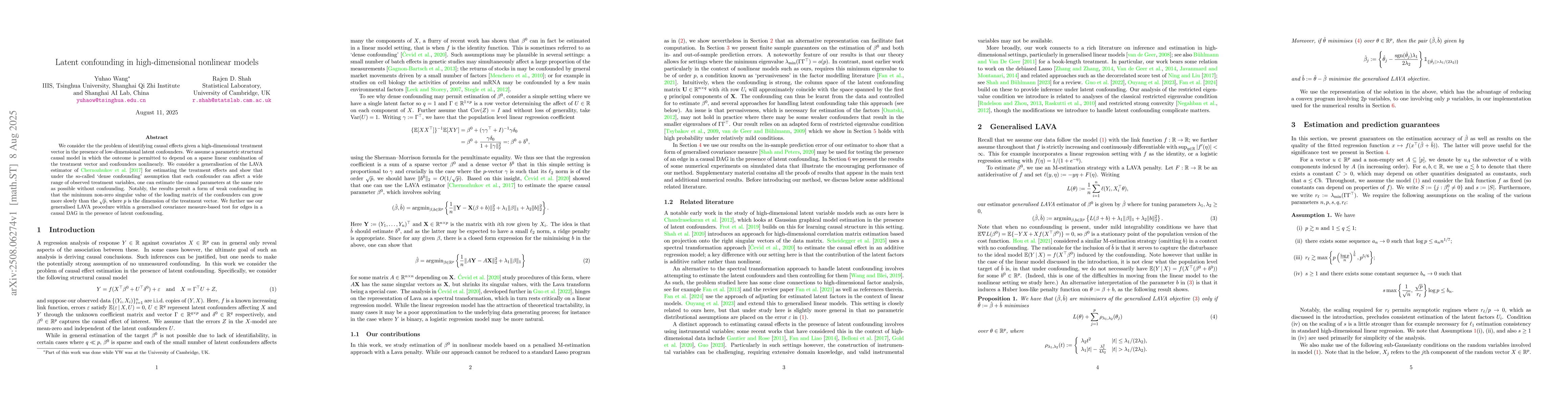 We consider the the problem of identifying causal effects given a high-dimensional treatment vector in the presence of low-dimensional latent confounders. We assume a parametric structural causal model in which the outcome is permitted to depend on a sparse linear combination of the treatment vector and confounders nonlinearly. We consider a generalisation of the LAVA estimator of Chernozhukov et al. [2017] for estimating the treatment effects and show that under the so-called `dense confounding' assumption that each confounder can affect a wide range of observed treatment variables, one can estimate the causal parameters at the same rate as possible without confounding. Notably, the results permit a form of weak confounding in that the minimum non-zero singular value of the loading matrix of the confounders can grow more slowly than the $\sqrt{p}$, where $p$ is the dimension of the treatment vector. We further use our generalised LAVA procedure within a generalised covariance measure-based test for edges in a causal DAG in the presence of latent confounding.