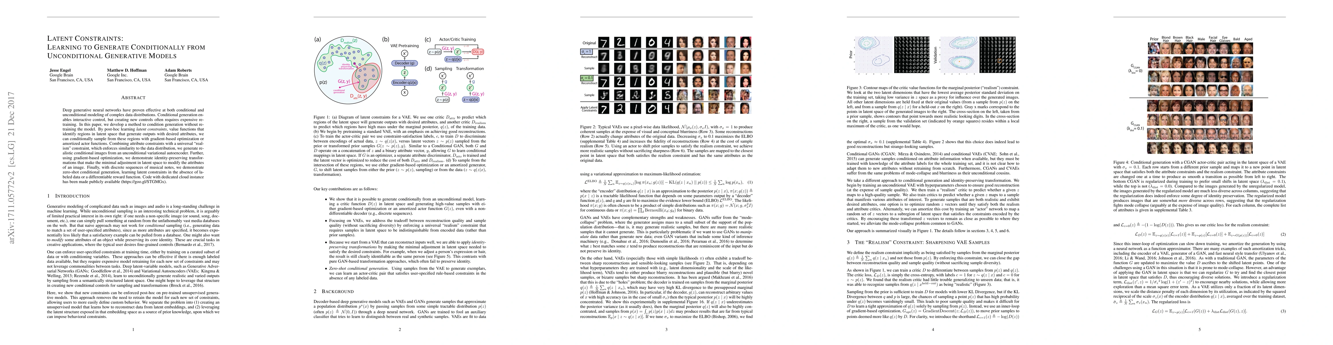 This paper proposes a method to condition generation from unconditional generative models without retraining, by learning latent constraints that identify regions in latent space corresponding to desired attributes. The approach enables realistic conditional image generation and identity-preserving transformations, as well as zero-shot conditional generation for musical notes.