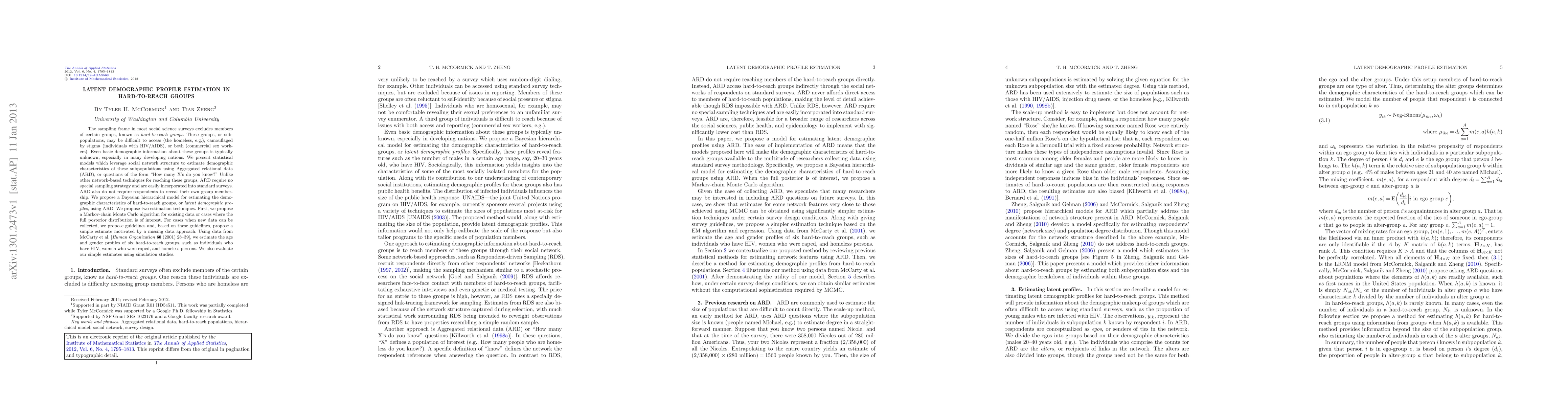 The sampling frame in most social science surveys excludes members of certain groups, known as hard-to-reach groups. These groups, or subpopulations, may be difficult to access (the homeless, e.g.), camouflaged by stigma (individuals with HIV/AIDS), or both (commercial sex workers). Even basic demographic information about these groups is typically unknown, especially in many developing nations. We present statistical models which leverage social network structure to estimate demographic characteristics of these subpopulations using Aggregated relational data (ARD), or questions of the form "How many X's do you know?" Unlike other network-based techniques for reaching these groups, ARD require no special sampling strategy and are easily incorporated into standard surveys. ARD also do not require respondents to reveal their own group membership. We propose a Bayesian hierarchical model for estimating the demographic characteristics of hard-to-reach groups, or latent demographic profiles, using ARD. We propose two estimation techniques. First, we propose a Markov-chain Monte Carlo algorithm for existing data or cases where the full posterior distribution is of interest. For cases when new data can be collected, we propose guidelines and, based on these guidelines, propose a simple estimate motivated by a missing data approach. Using data from McCarty et al. [Human Organization 60 (2001) 28-39], we estimate the age and gender profiles of six hard-to-reach groups, such as individuals who have HIV, women who were raped, and homeless persons. We also evaluate our simple estimates using simulation studies.