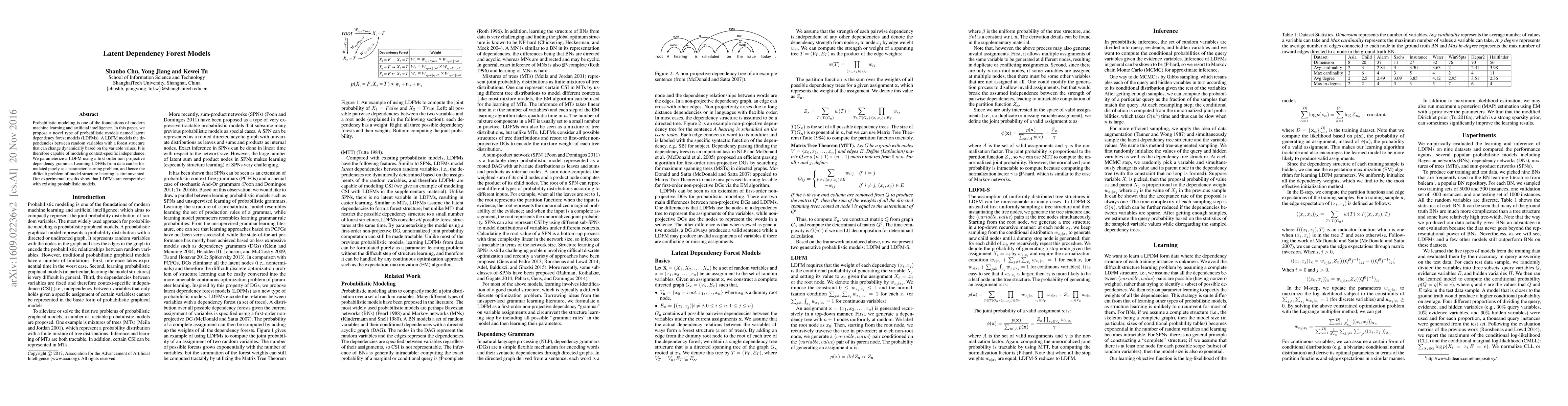 This paper introduces latent dependency forest models (LDFMs), a novel type of probabilistic model that dynamically adjusts its forest structure to model context-specific independence. LDFMs are parameterized using a first-order non-projective dependency grammar, and their learning is formulated as a parameter optimization problem, avoiding complex structure learning. Experimental results indicate that LDFMs are competitive with existing probabilistic models.