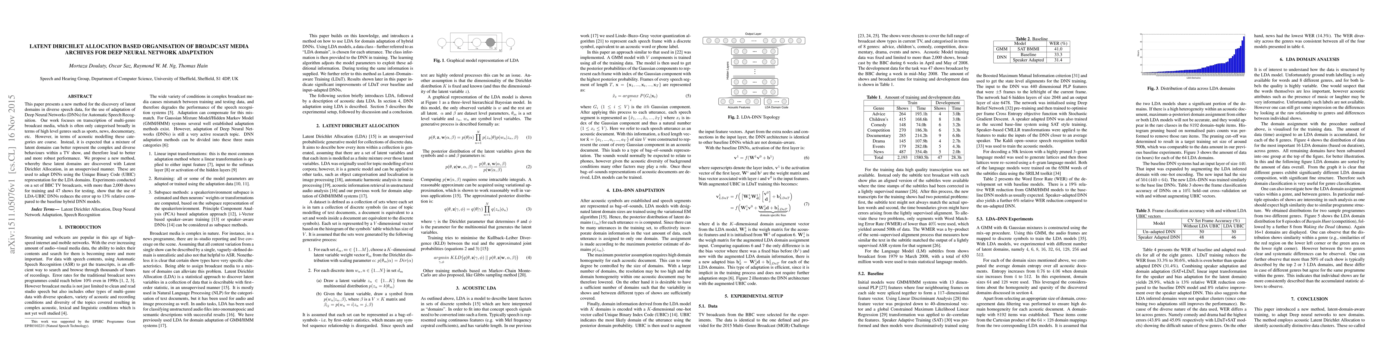 This paper introduces a method using Latent Dirichlet Allocation to identify latent domains in diverse speech data for improving Deep Neural Network adaptation in Automatic Speech Recognition. The proposed approach, utilizing Unique Binary Code representation, demonstrates a 13% relative reduction in error compared to baseline models on BBC TV broadcasts.