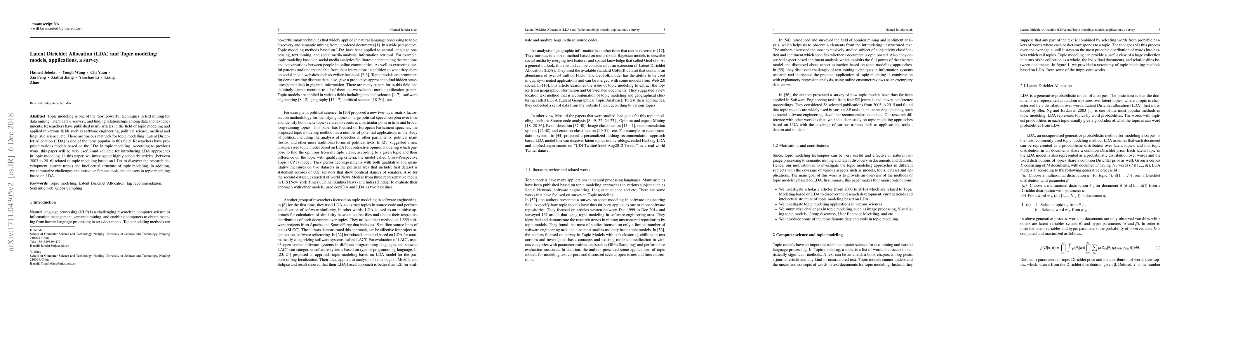 This paper surveys scholarly articles on Latent Dirichlet Allocation (LDA) and topic modeling from 2003 to 2016, highlighting research development, trends, and the intellectual structure of the field. It also discusses challenges and introduces prominent tools and datasets used in LDA-based topic modeling.