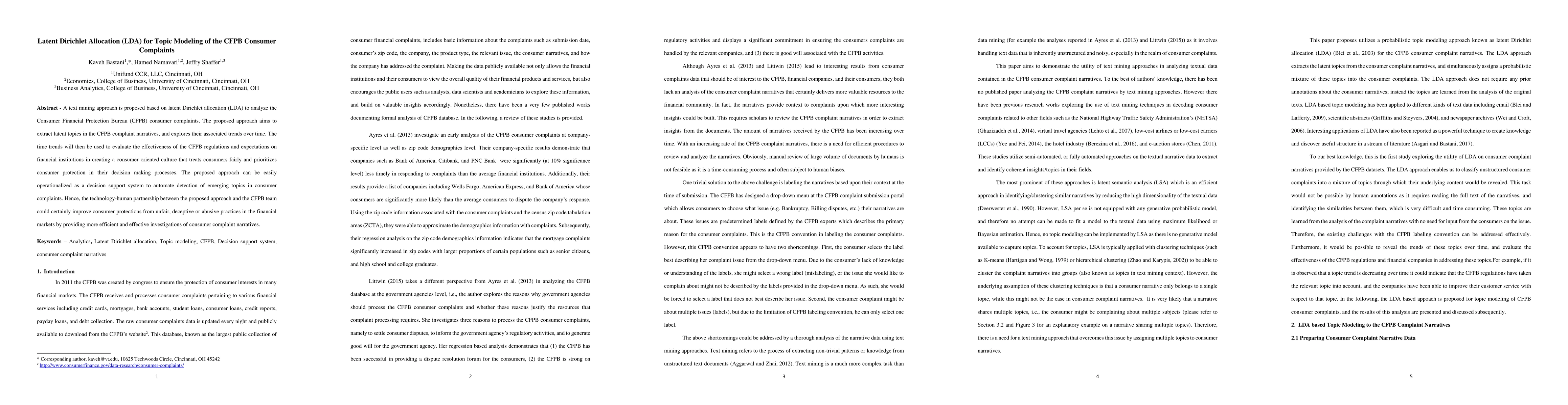 A study proposes using Latent Dirichlet Allocation (LDA) to analyze CFPB consumer complaints, extracting latent topics and trends over time to evaluate regulatory effectiveness.
