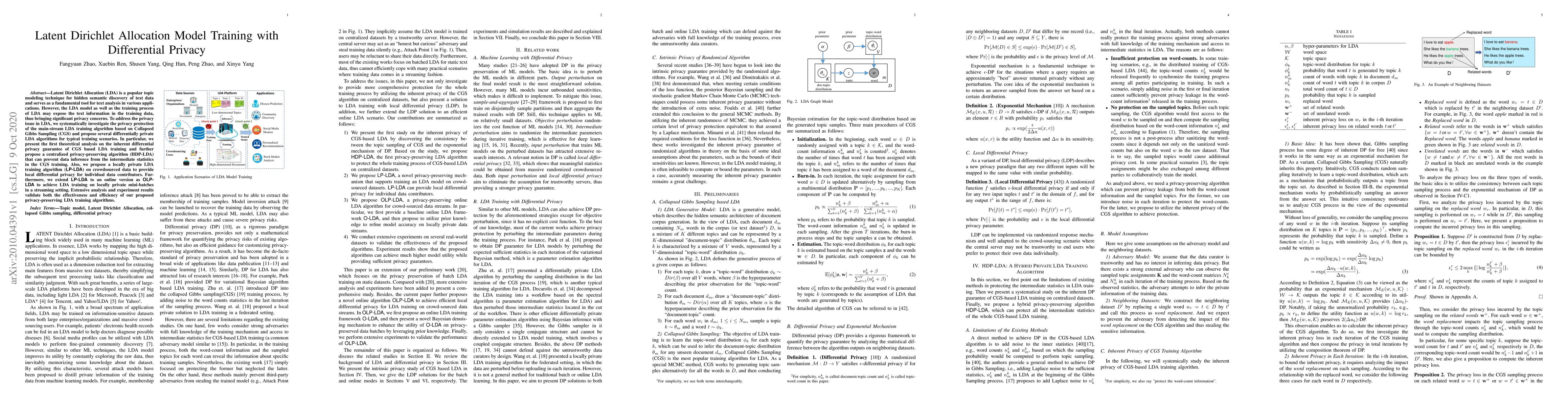 This paper proposes differentially private Latent Dirichlet Allocation (LDA) algorithms to address privacy concerns during LDA training. It introduces HDP-LDA for centralized privacy protection and LP-LDA for local privacy in crowdsourced data, extending LP-LDA to OLP-LDA for streaming settings. Experimental results demonstrate the effectiveness and efficiency of these privacy-preserving LDA training methods.