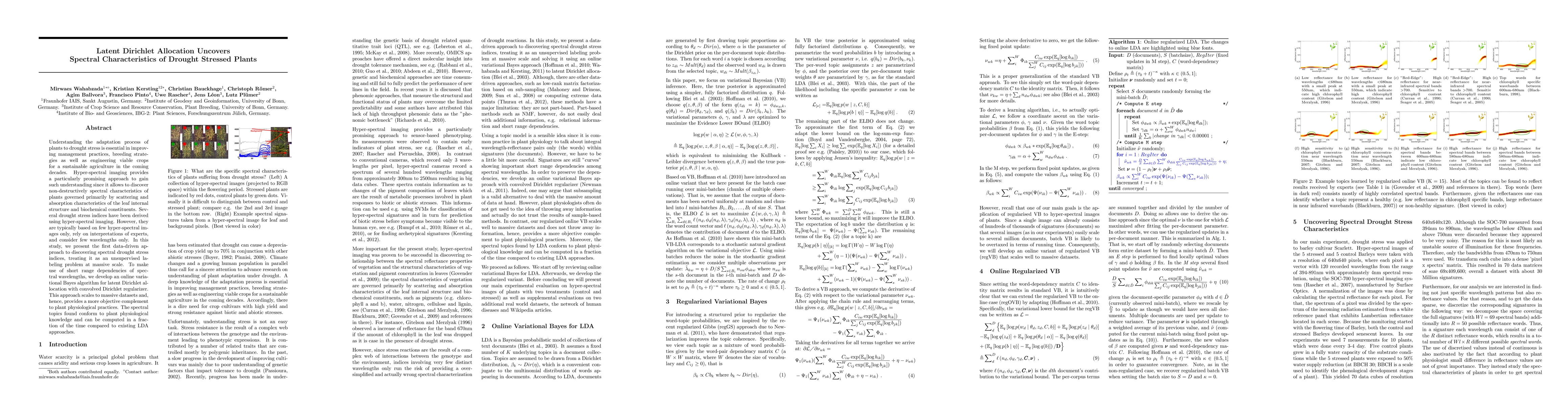 This study uses a data-driven approach based on latent Dirichlet allocation to discover spectral drought stress indices from hyper-spectral imaging, offering a scalable and objective method to understand plant adaptation to drought stress. The developed online variational Bayes algorithm efficiently identifies spectral characteristics, complementing traditional expert-based methods.