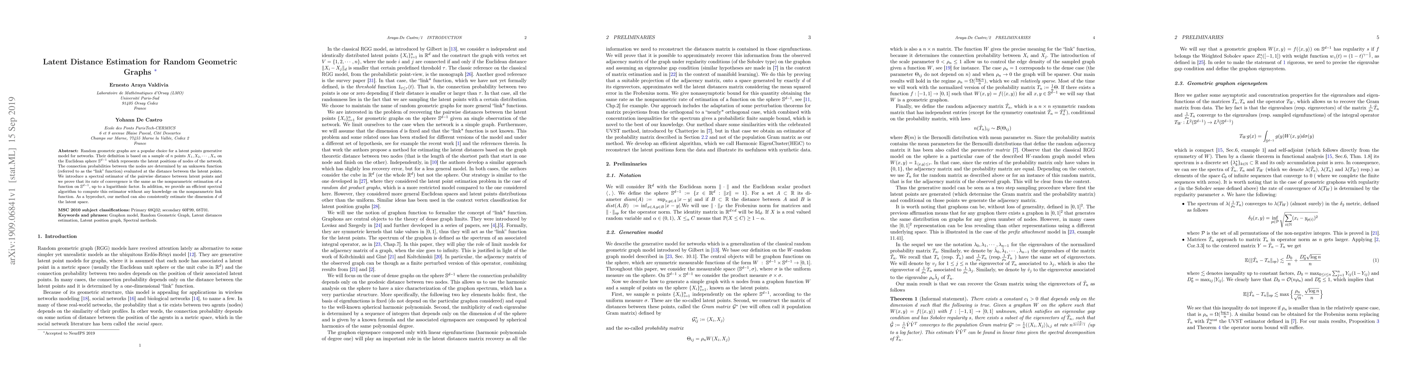 This paper introduces a spectral estimator for the pairwise distance between latent points in random geometric graphs, proving its convergence rate and providing an efficient algorithm for computation without requiring knowledge of the link function. The method also enables consistent estimation of the latent space dimension.