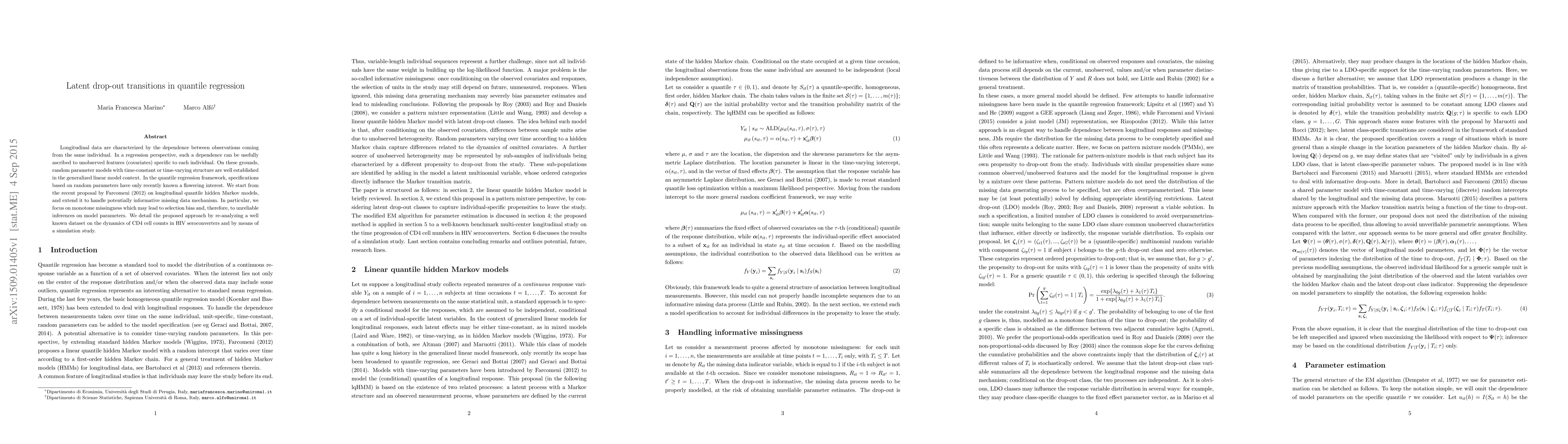 This paper extends longitudinal quantile hidden Markov models to address informative missing data, specifically monotone drop-outs, in quantile regression. The approach aims to mitigate selection bias and improve parameter inference, demonstrated through re-analysis of a CD4 cell count dataset and simulation studies.