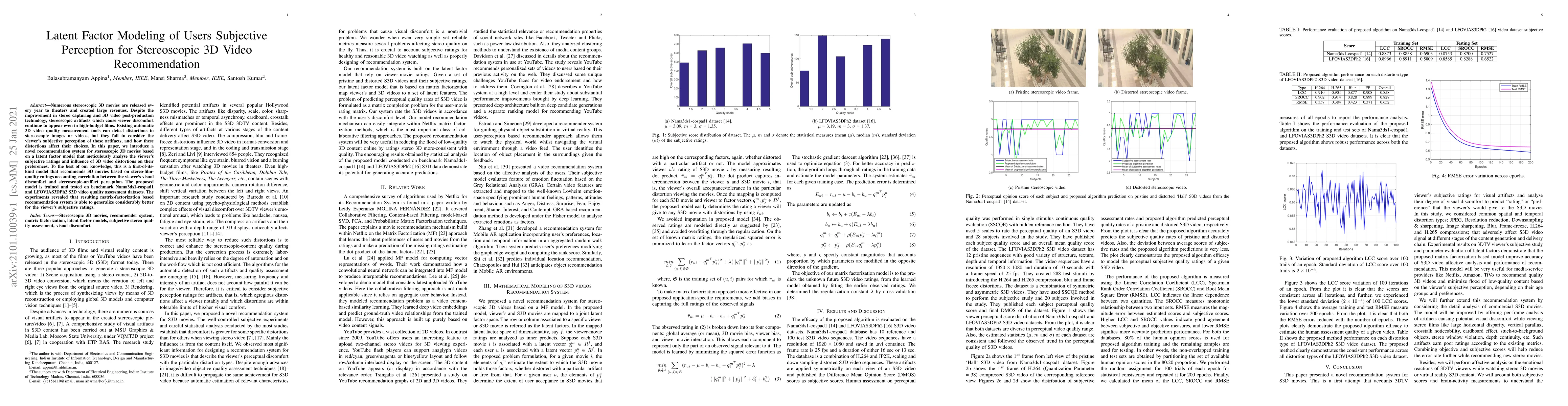 This paper proposes a novel recommendation system for stereoscopic 3D movies using a latent factor model that considers viewer subjective perception of stereoscopic artifacts. The model generalizes better for subjective ratings compared to existing tools, demonstrating improved recommendation accuracy based on viewer discomfort and artifact perception.