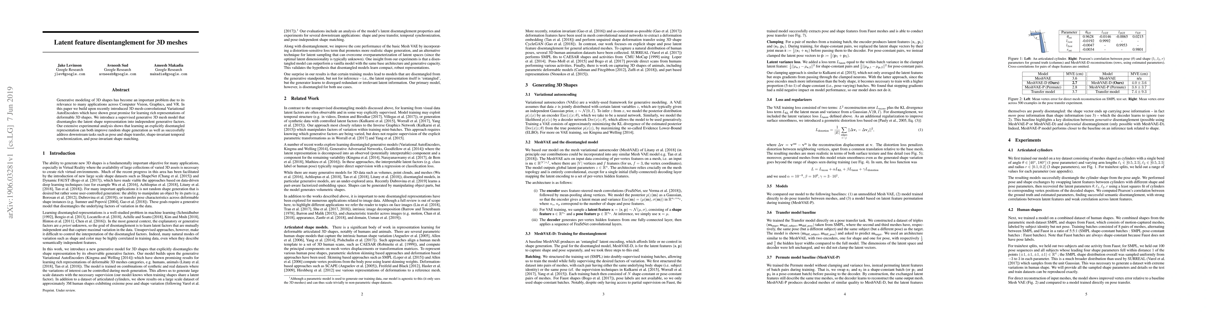This paper proposes a supervised generative 3D mesh model that disentangles latent shape representations into independent factors, improving random shape generation and addressing downstream tasks like pose and shape transfer, shape-invariant synchronization, and pose-invariant shape matching. The approach builds on 3D mesh-convolutional Variational AutoEncoders.