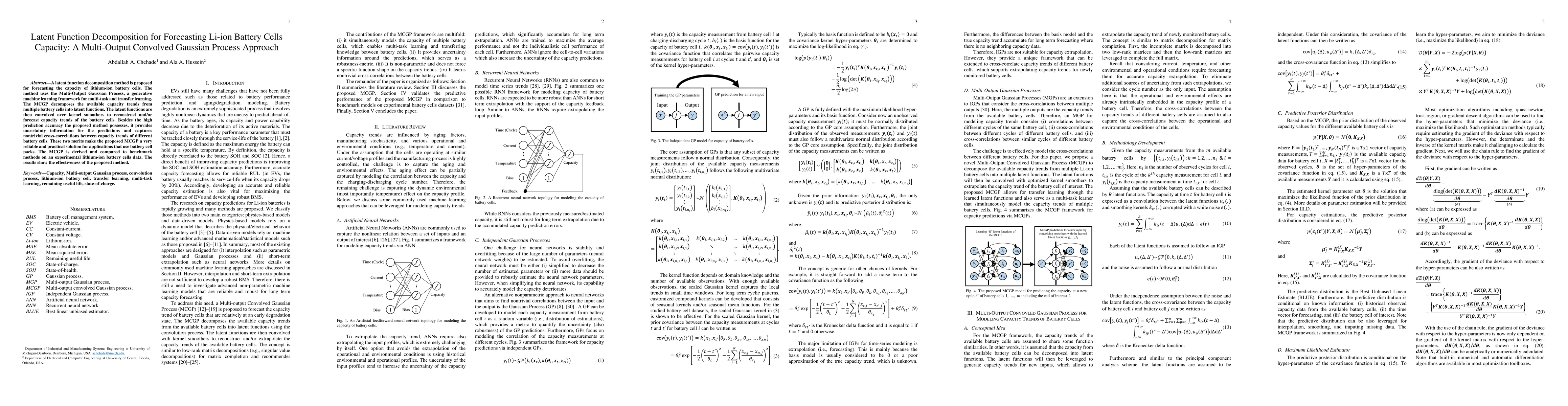 This paper proposes a latent function decomposition method using Multi-Output Convolved Gaussian Processes (MCGP) for forecasting lithium-ion battery cell capacity. The method accurately predicts capacity trends while providing uncertainty information and capturing cross-correlations between different cells, demonstrating its effectiveness through experimental comparisons.