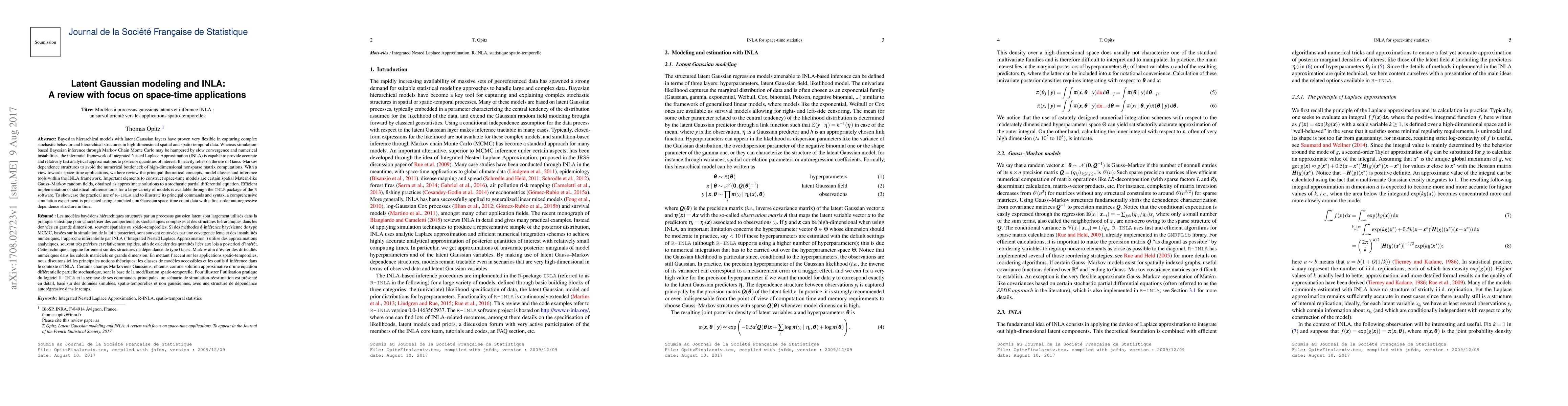 This paper reviews latent Gaussian modeling and the Integrated Nested Laplace Approximation (INLA) framework, focusing on space-time applications. INLA provides fast analytical approximations to posterior quantities, avoiding the numerical challenges of high-dimensional computations, and is particularly effective for complex spatial and spatio-temporal data.