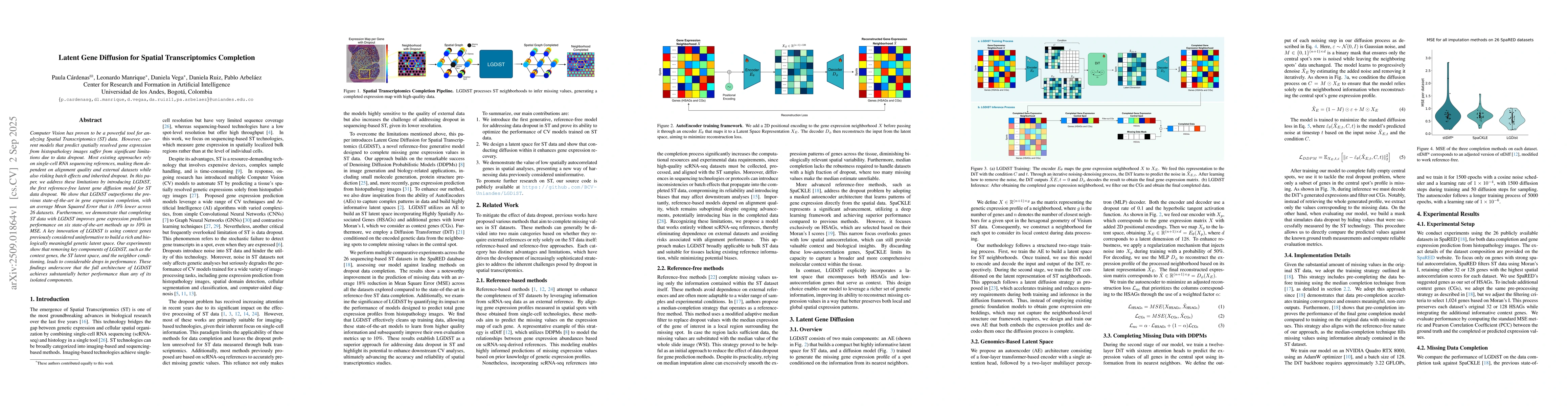 Computer Vision has proven to be a powerful tool for analyzing Spatial Transcriptomics (ST) data. However, current models that predict spatially resolved gene expression from histopathology images suffer from significant limitations due to data dropout. Most existing approaches rely on single-cell RNA sequencing references, making them dependent on alignment quality and external datasets while also risking batch effects and inherited dropout. In this paper, we address these limitations by introducing LGDiST, the first reference-free latent gene diffusion model for ST data dropout. We show that LGDiST outperforms the previous state-of-the-art in gene expression completion, with an average Mean Squared Error that is 18% lower across 26 datasets. Furthermore, we demonstrate that completing ST data with LGDiST improves gene expression prediction performance on six state-of-the-art methods up to 10% in MSE. A key innovation of LGDiST is using context genes previously considered uninformative to build a rich and biologically meaningful genetic latent space. Our experiments show that removing key components of LGDiST, such as the context genes, the ST latent space, and the neighbor conditioning, leads to considerable drops in performance. These findings underscore that the full architecture of LGDiST achieves substantially better performance than any of its isolated components.