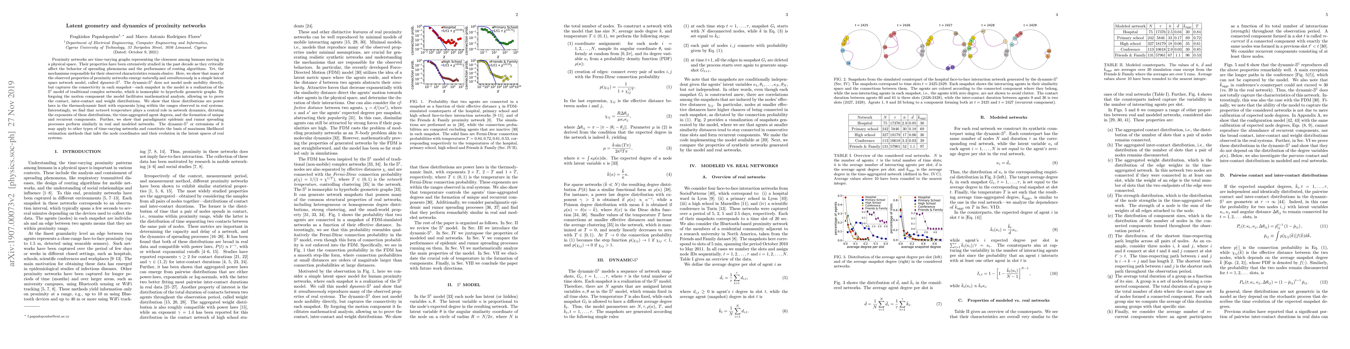 Proximity networks are time-varying graphs representing the closeness among humans moving in a physical space. Their properties have been extensively studied in the past decade as they critically affect the behavior of spreading phenomena and the performance of routing algorithms. Yet, the mechanisms responsible for their observed characteristics remain elusive. Here, we show that many of the observed properties of proximity networks emerge naturally and simultaneously in a simple latent space network model, called dynamic-$\mathbb{S}^{1}$. The dynamic-$\mathbb{S}^{1}$ does not model node mobility directly, but captures the connectivity in each snapshot---each snapshot in the model is a realization of the $\mathbb{S}^{1}$ model of traditional complex networks, which is isomorphic to hyperbolic geometric graphs. By forgoing the motion component the model facilitates mathematical analysis, allowing us to prove the contact, inter-contact and weight distributions. We show that these distributions are power laws in the thermodynamic limit with exponents lying within the ranges observed in real systems. Interestingly, we find that network temperature plays a central role in network dynamics, dictating the exponents of these distributions, the time-aggregated agent degrees, and the formation of unique and recurrent components. Further, we show that paradigmatic epidemic and rumor spreading processes perform similarly in real and modeled networks. The dynamic-$\mathbb{S}^{1}$ or extensions of it may apply to other types of time-varying networks and constitute the basis of maximum likelihood estimation methods that infer the node coordinates and their evolution in the latent spaces of real systems.