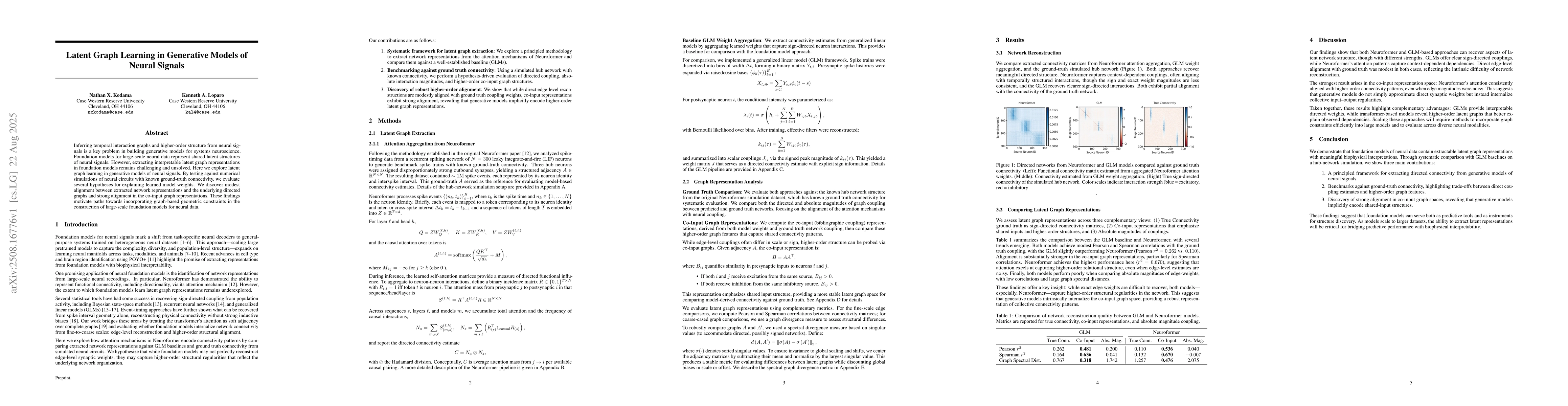 Inferring temporal interaction graphs and higher-order structure from neural signals is a key problem in building generative models for systems neuroscience. Foundation models for large-scale neural data represent shared latent structures of neural signals. However, extracting interpretable latent graph representations in foundation models remains challenging and unsolved. Here we explore latent graph learning in generative models of neural signals. By testing against numerical simulations of neural circuits with known ground-truth connectivity, we evaluate several hypotheses for explaining learned model weights. We discover modest alignment between extracted network representations and the underlying directed graphs and strong alignment in the co-input graph representations. These findings motivate paths towards incorporating graph-based geometric constraints in the construction of large-scale foundation models for neural data.