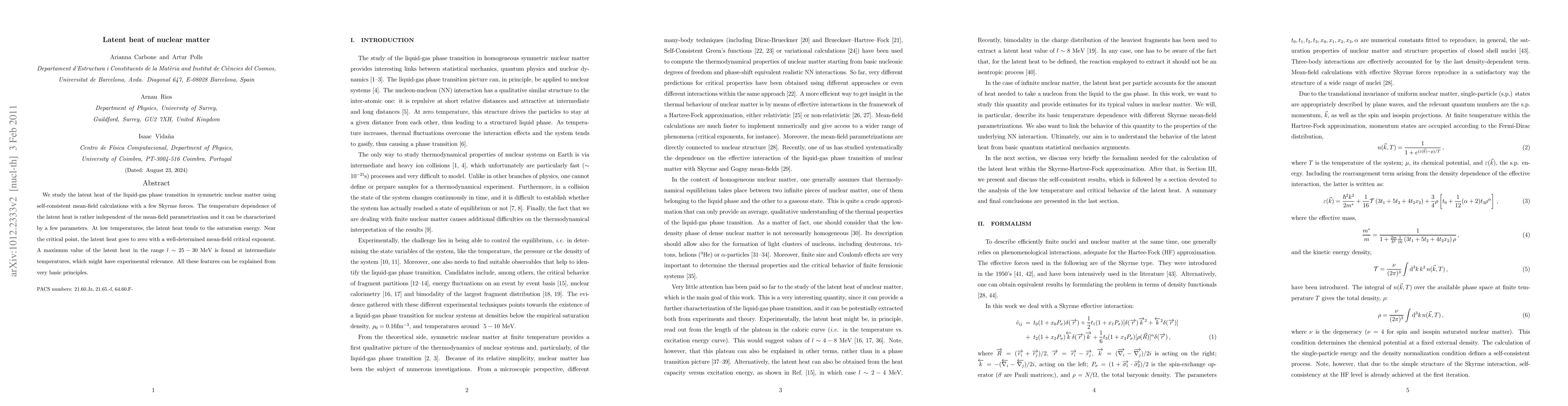 We study the latent heat of the liquid-gas phase transition in symmetric nuclear matter using self-consistent mean-field calculations with a few Skyrme forces. The temperature dependence of the latent heat is rather independent of the mean-field parametrization and can be characterized by a few parameters. At low temperatures, the latent heat tends to the saturation energy. Near the critical point, the latent heat goes to zero with a well-determined mean-field critical exponent. A maximum value of the latent heat in the range l ~ 25-30 MeV is found at intermediate temperatures, which might have experimental relevance. All these features can be explained from very basic principles.